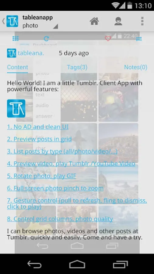 Tablean is a little Tumblr Client App. It is quick, lite and clean and help people browse Tumblr photos, videos and other posts smoothly.