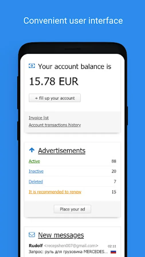 From now on, you do not need to visit the website: all the necessary functions are available in the app. Place your ads, communicate with sellers, subscribe to ads you are interested in.