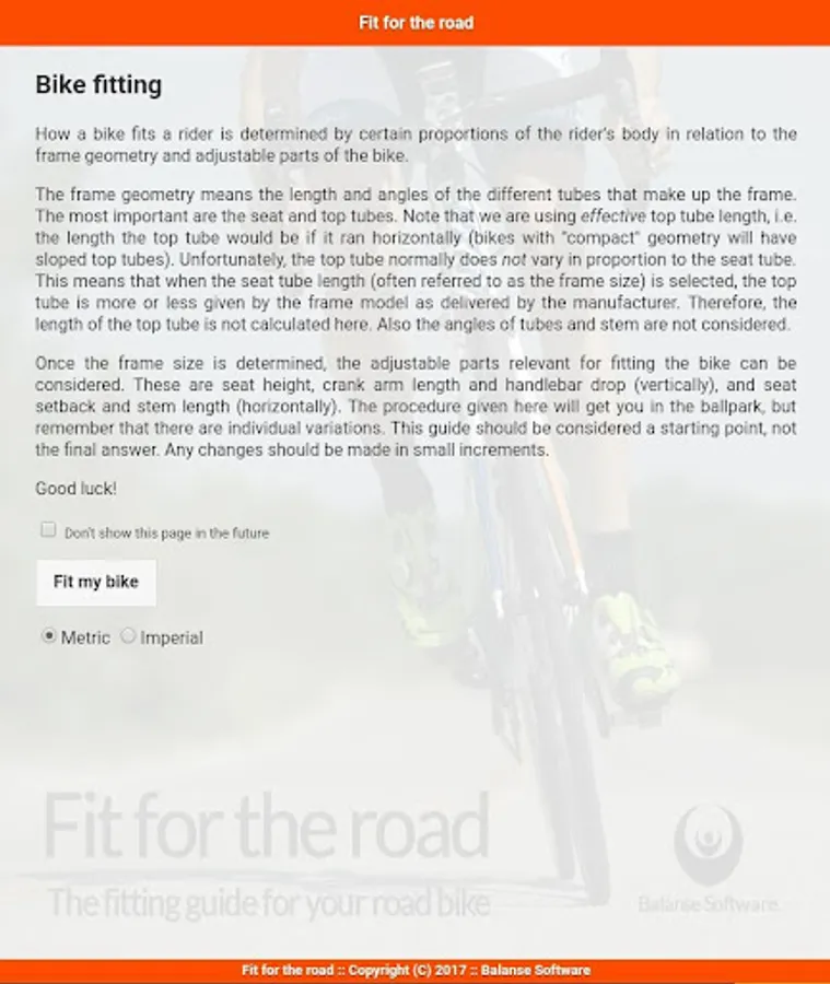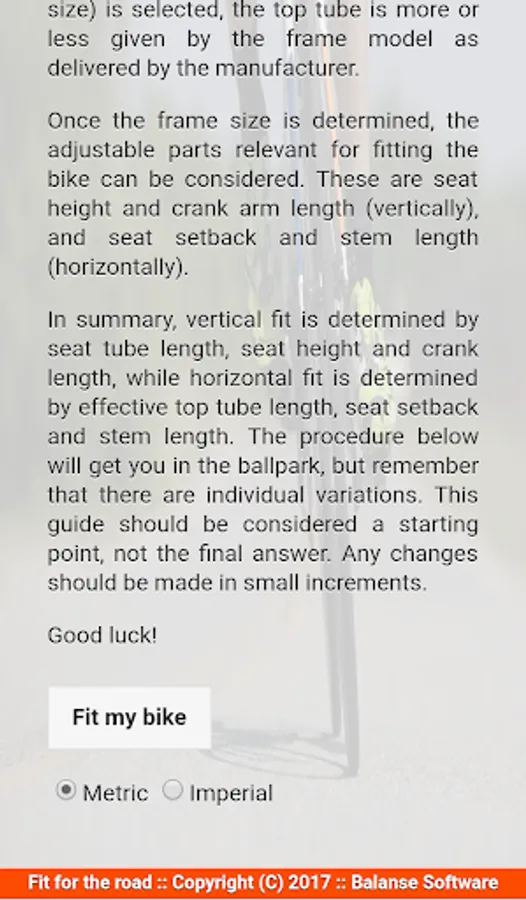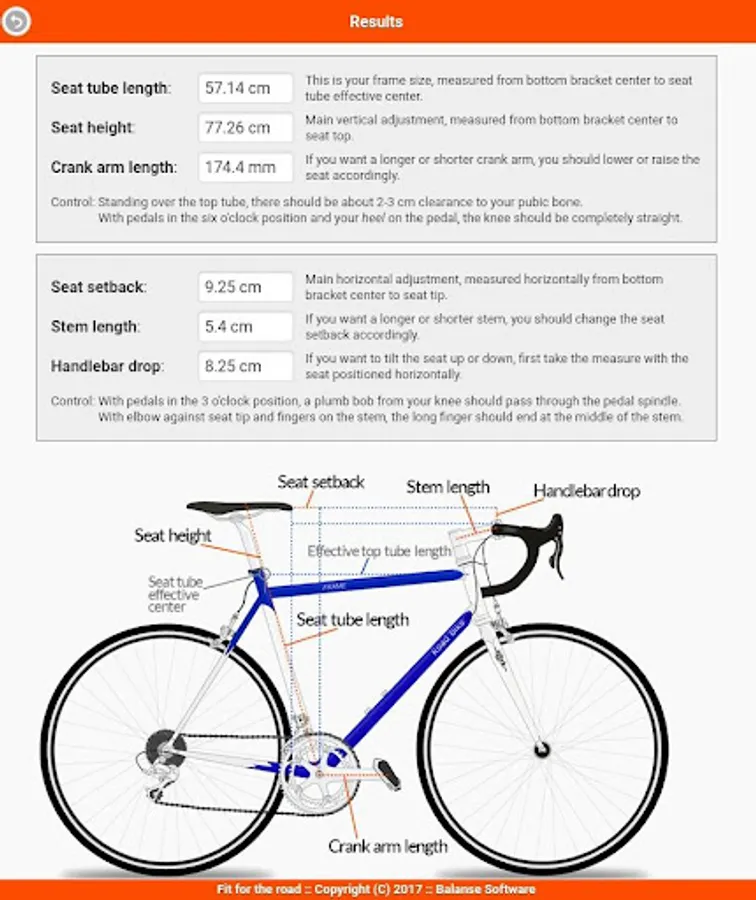 How a bike fits a rider is determined by certain proportions of the rider's body in relation to the frame geometry and adjustable parts of the bike. Fit For The Road calculates frame size, saddle height and saddle offset as well as stem and crank arm length bases on a few body measurements.
