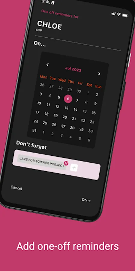 > As required, add one-off reminders - don't forget that cash for the Mother's Day stall!