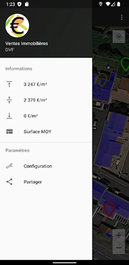 Allows you to display, according to your geographical position or a defined area, the land transactions made available in the DVF database (Requests for Land Value) made open data by the DGFiP.