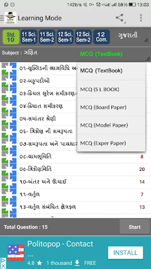 2) Exam Mode : In Exam Mode the students can select Number of Questions for the GSEB ALL MCQ Question Bank and can do exam practice.