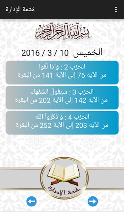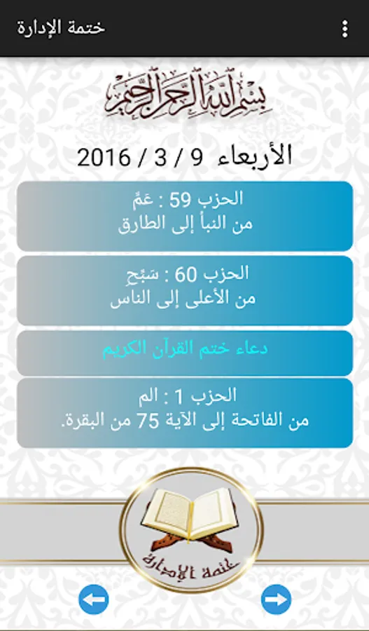 - Know the parties which are read every day by its history, according to the program "khatmahs administration," which is appointed to accompany the attendees on this complete it and seal the Koran with them every three weeks (by clicking on the next Alchtmat dates in the application, you can figure out nights to complete it) dates.