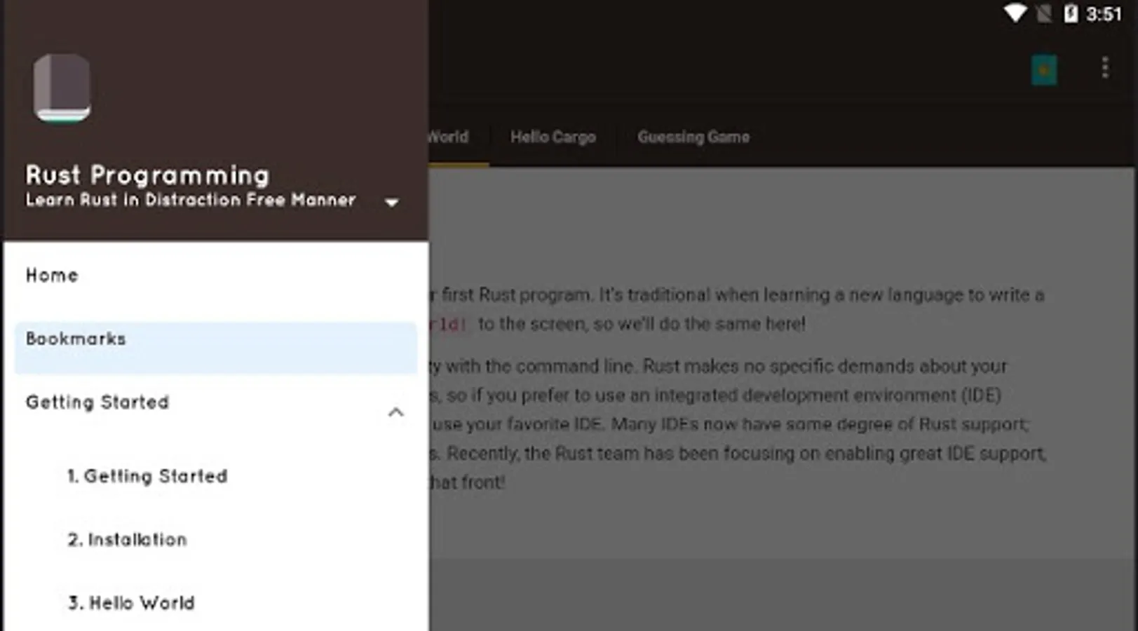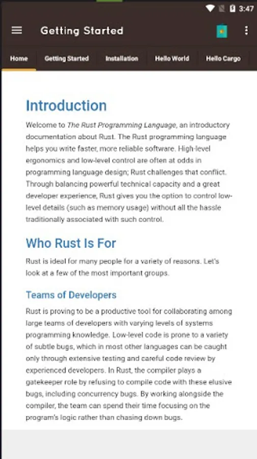 Rust is a systems programming language that is currently trending among the programming languages. This app provides you Rust programming language documentation natively from start to finish. It is especially suitable for programmers coming from other languages.