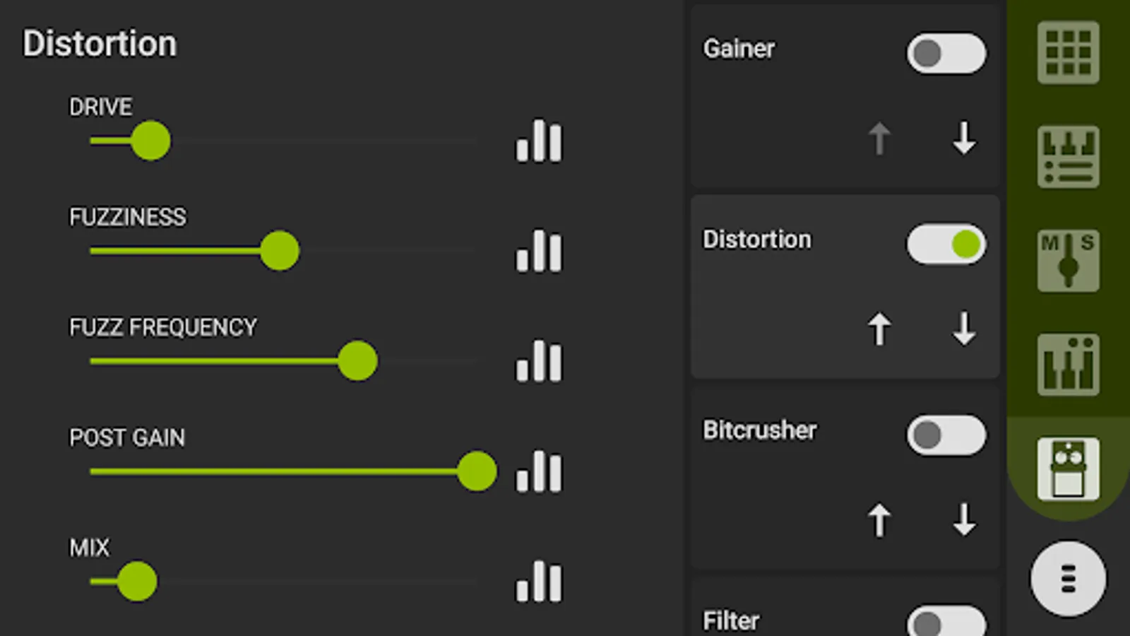 * 10 built in effects: Gainer, Distortion, Bitcrusher, Filter, 3 Band EQ, Tremolo, Flanger, Chorus, Delay, Reverb.