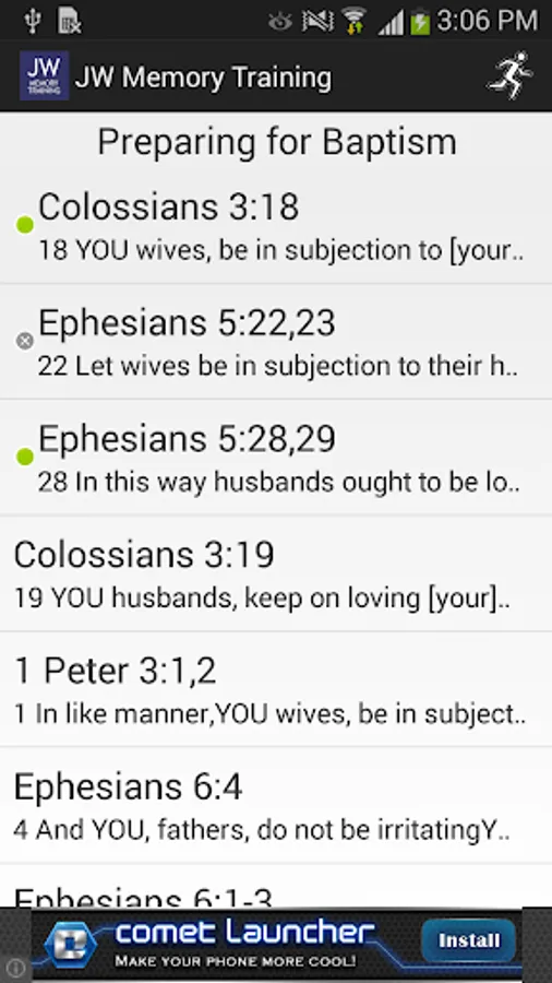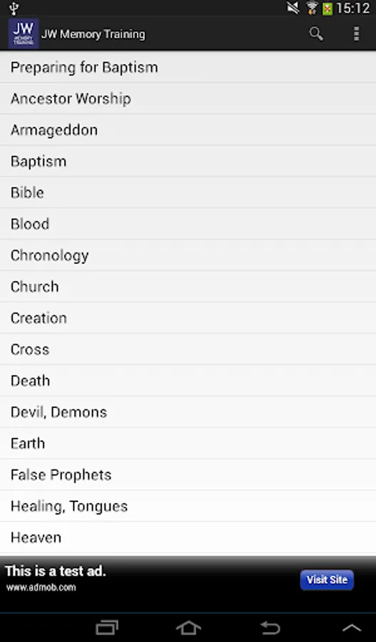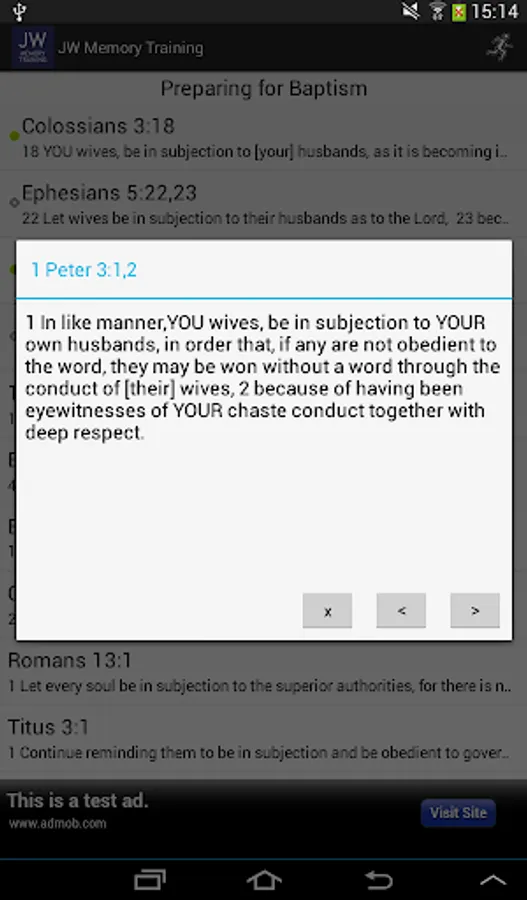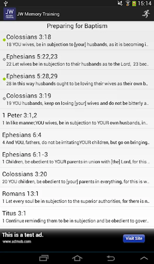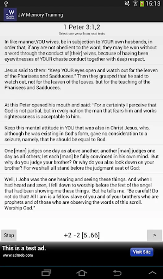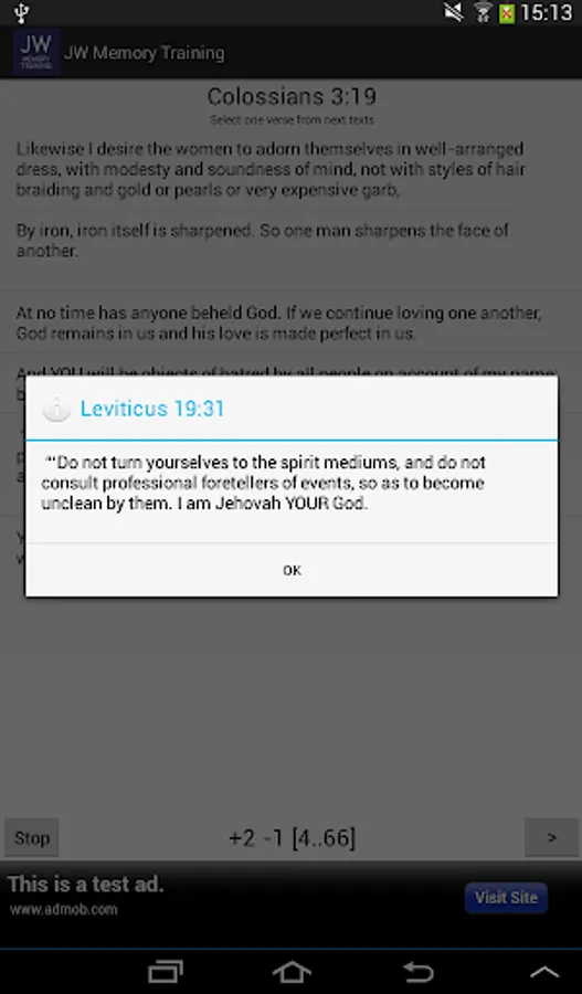 3) You can train your memory, selecting the subject and pressing the 'Start learning'; program will offer you the index of the verse and text options . To guess the correct verse, so you can see your results and train your memory.