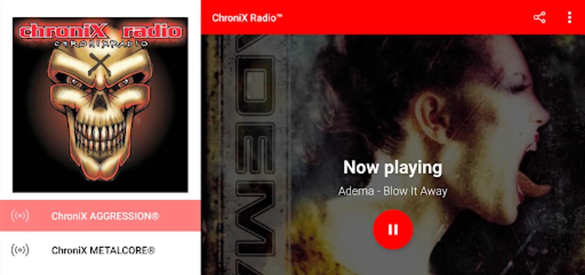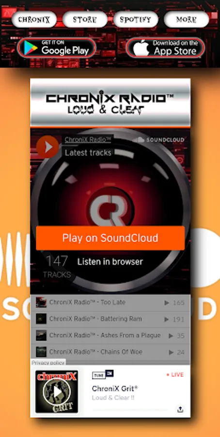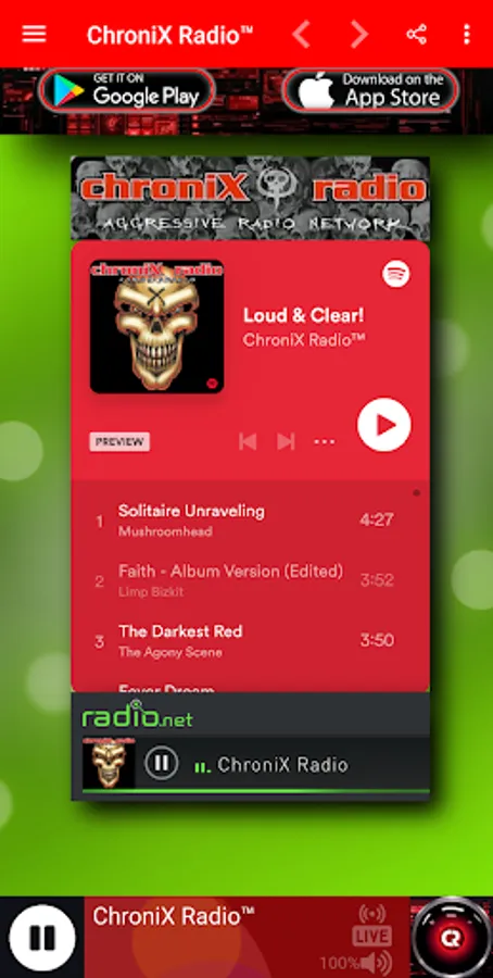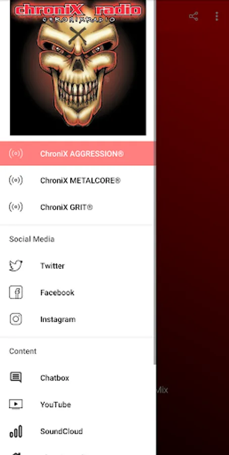 ChroniX Radio™, it isn't just radio, it's an experience. We provide Music, Online Radio, Entertainment, Liveshows, Metalhead Community, Chat, Now Playing information and Requests. We play everything from Metal, Nu Metal, Alternative Metal, Hard Rock, DJent, Industrial Metal, Metalcore, Melodic Metal, Thrash Metal, Death Metal, Technical Death Metal, Deathcore, Grindcore, hXc, Stoner Metal, Grunge, Sludge, Black Metal and a lot more! We have a wide variety available and something for everyone. You have 4 different stations to choose from; ChroniX Radio™, ChroniX Aggression®, ChroniX Metalcore® and ChroniX Grit®.