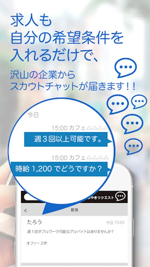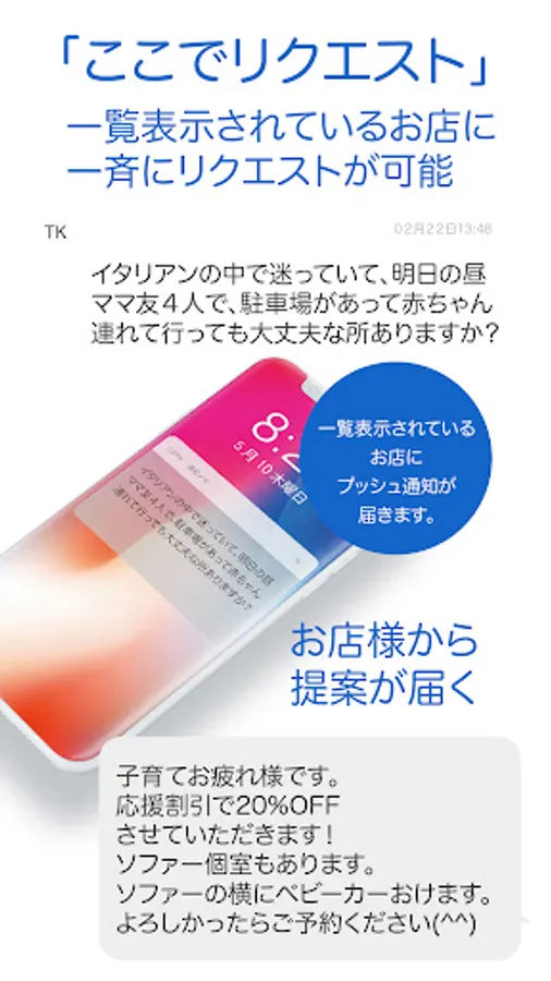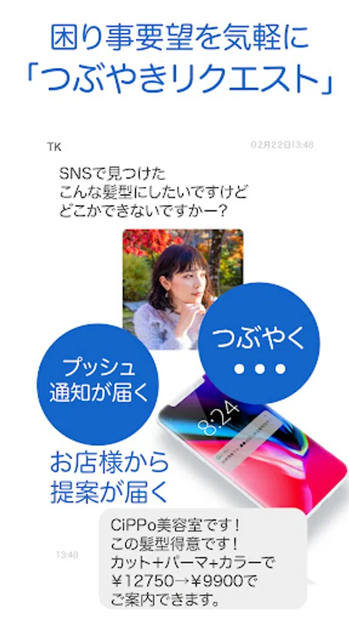 希望やお悩みなどをユーザーがつぶやけば、その内容が対象のお店全てにプッシュ通知が届き、そのままチャットで個別に提案できるサービス 。
