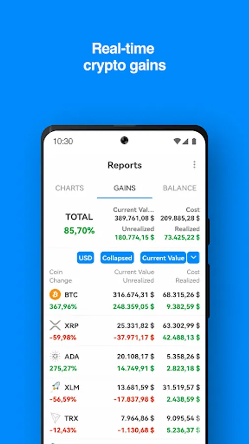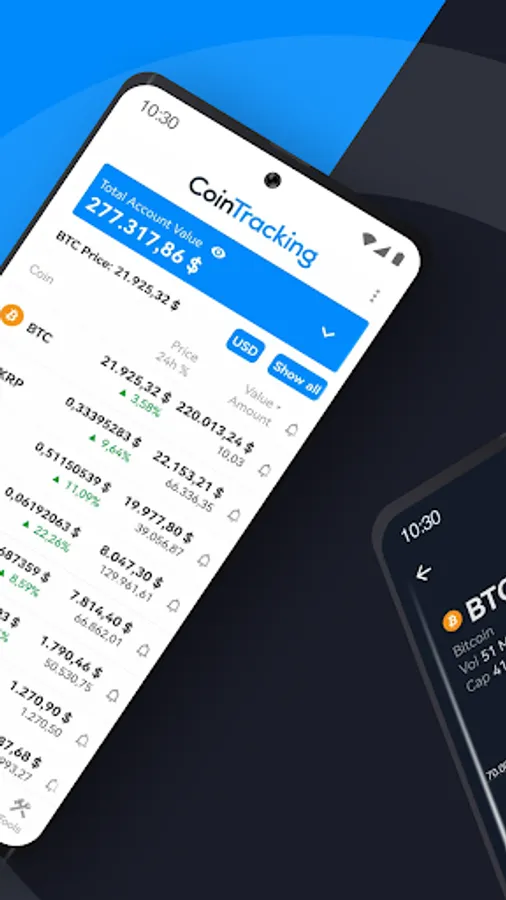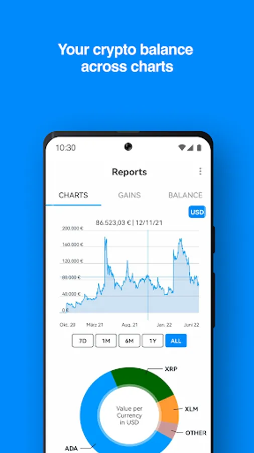 With the CoinTracking app, you can visually track your favorite cryptocurrencies with advanced charts and stats (e.g., portfolio distribution, historical balances) while being on top of actionable market indicators.