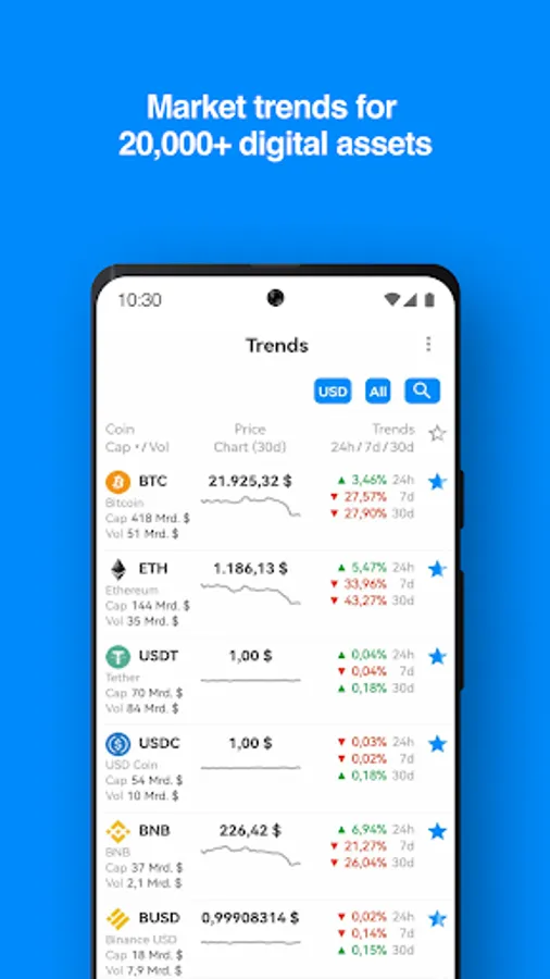 Modify your app template by switching between a day/night mode, set up price alerts in your portfolio, take advantage of widgets for quick access to your portfolio, get historical coin trends, and much more!