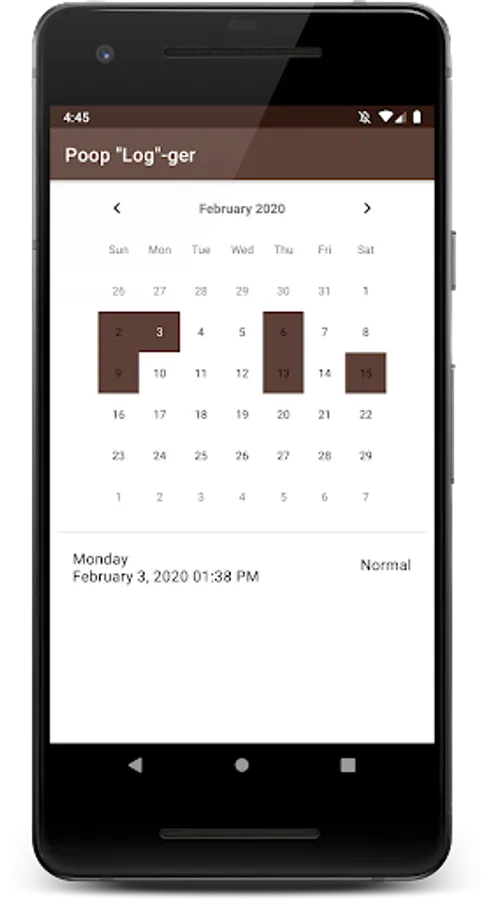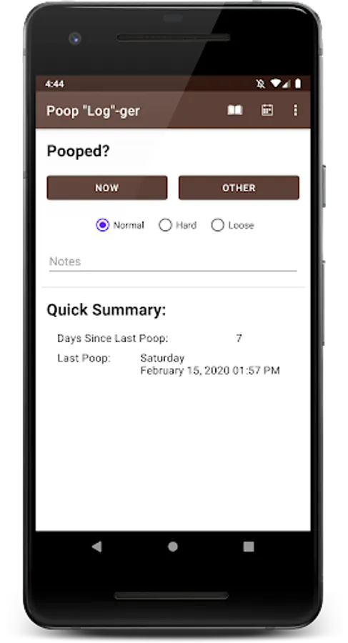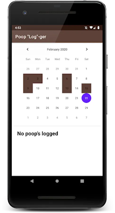 Calendar - Shows a calendar of all the poops. A brown highlighted day indicates a poop was on that day. A Circle highlighted day is the current day and it's brown if there's a poop on the day. When you click on a day, a list of the "poop's" for that day will display at the bottom. In that list, you can edit or delete a chosen poop.