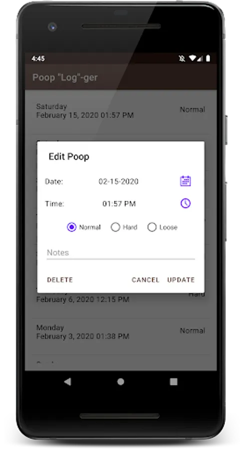 History - Shows a list of all the poops. If you long-press on the poop, you can edit or delete it.