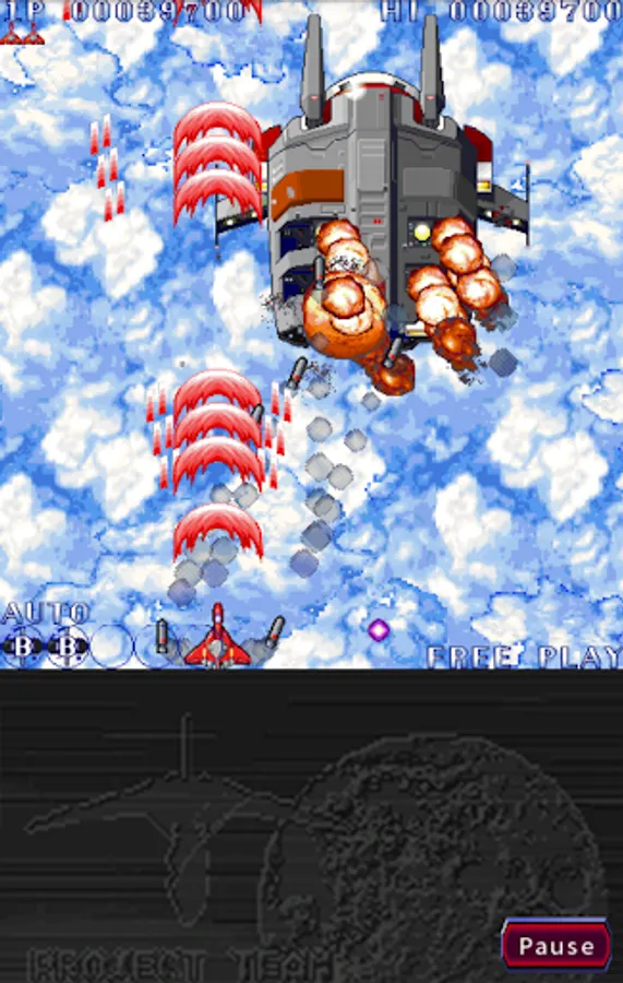 Control a ship and shoot enemies while avoiding enemy fire. Power-up items appear when some enemies are destroyed. There are 3 items: Power-up (red), missile (green), bomber (blue). Defeat the target enemy at end of the stage to clear the stage. When all stages are cleared or all lives and credits reach zero the game is over.