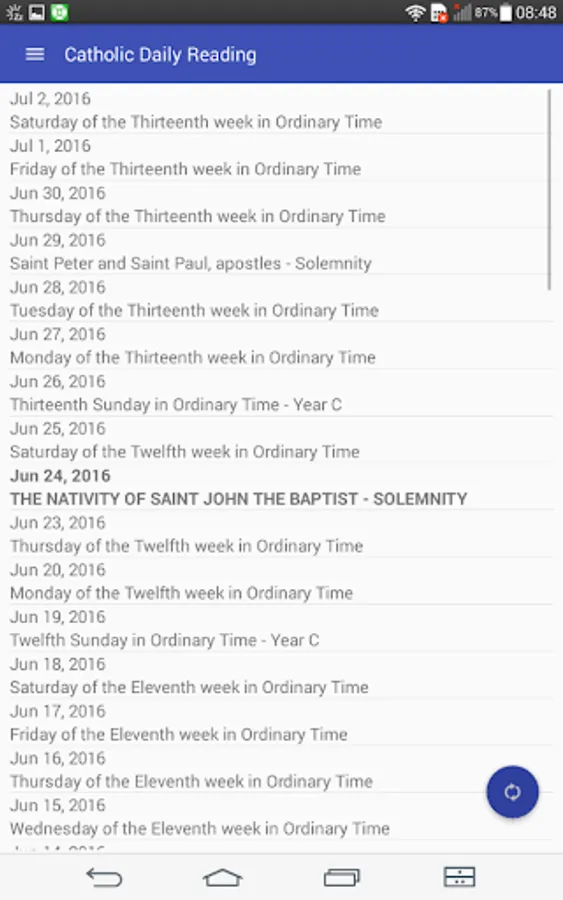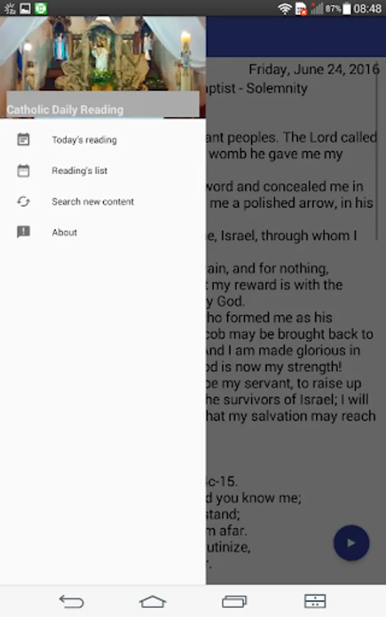 This application only needs Internet at least once in a month, to let the mobile device downloads the readings, so the user does not need to be always connected to access the content that corresponds to each day.