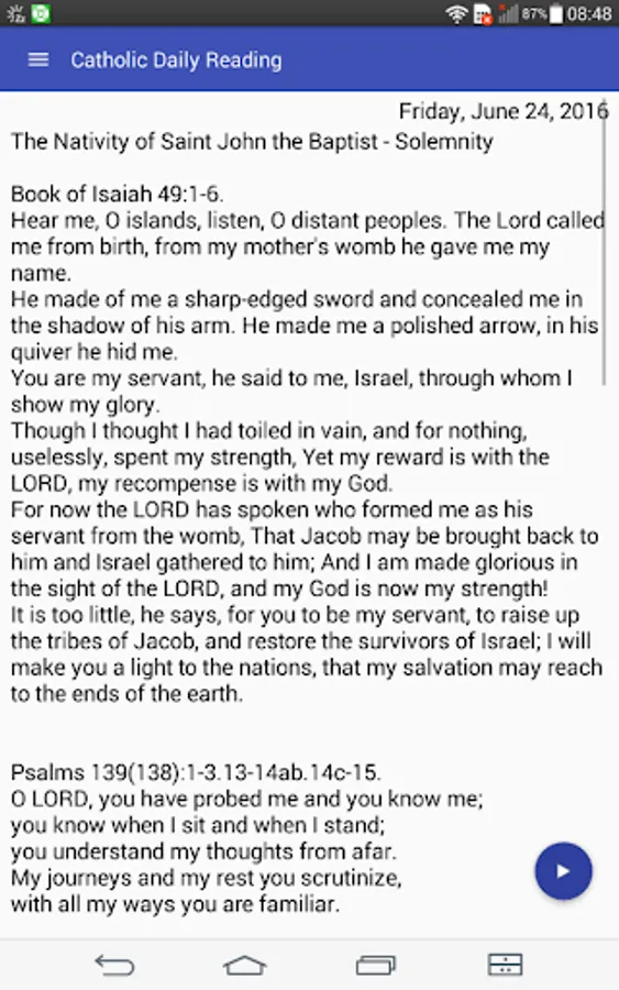 This application lets you read or hear (via synthesized voice) Bible readings corresponding to each day, as dictated by the Catholic Church.