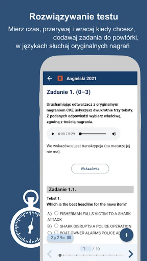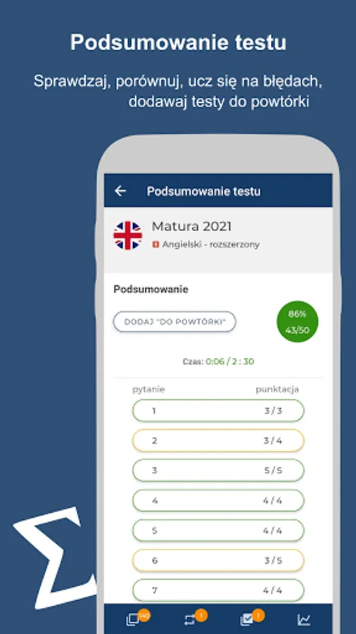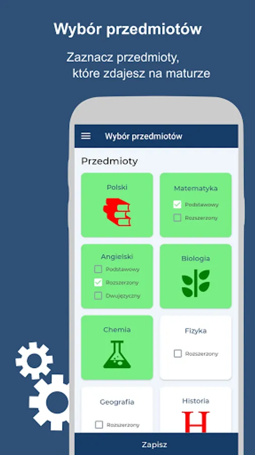 Thanks to the application, you will test your knowledge and prepare better for the final exams. You have at your disposal tests and final exams in the following subjects: Polish, mathematics, English, biology, chemistry, physics, geography, history, WOS, IT, German, Russian, Spanish, French, Italian, philosophy, history of art and music, and Latin.