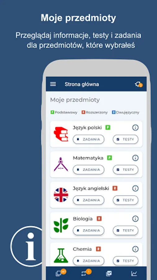 Since you usually prepare for the Matura exam in 3-6 subjects, only the tests and tasks that you have marked on the list of subjects appear in My Study and on the lists. You can add a new item or deselect an unnecessary one at any time.