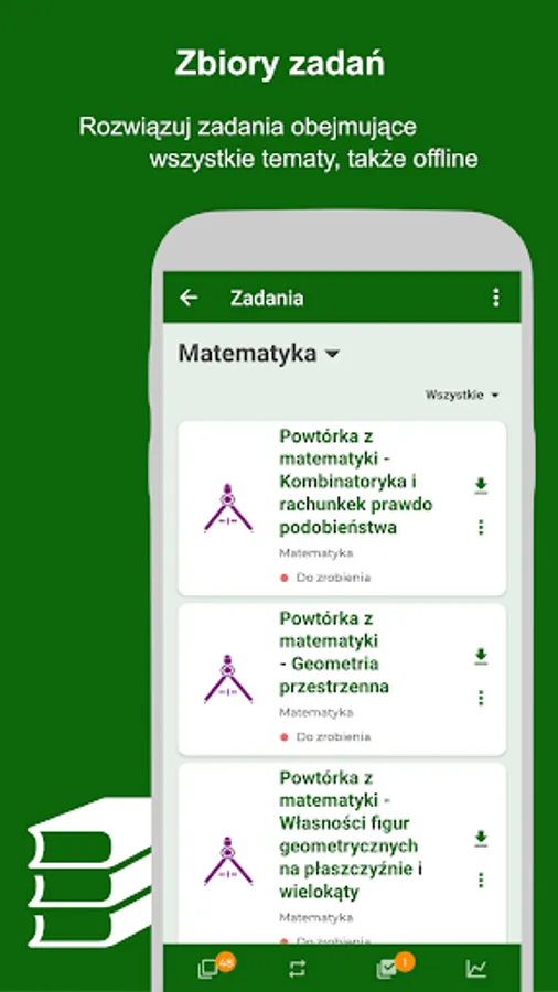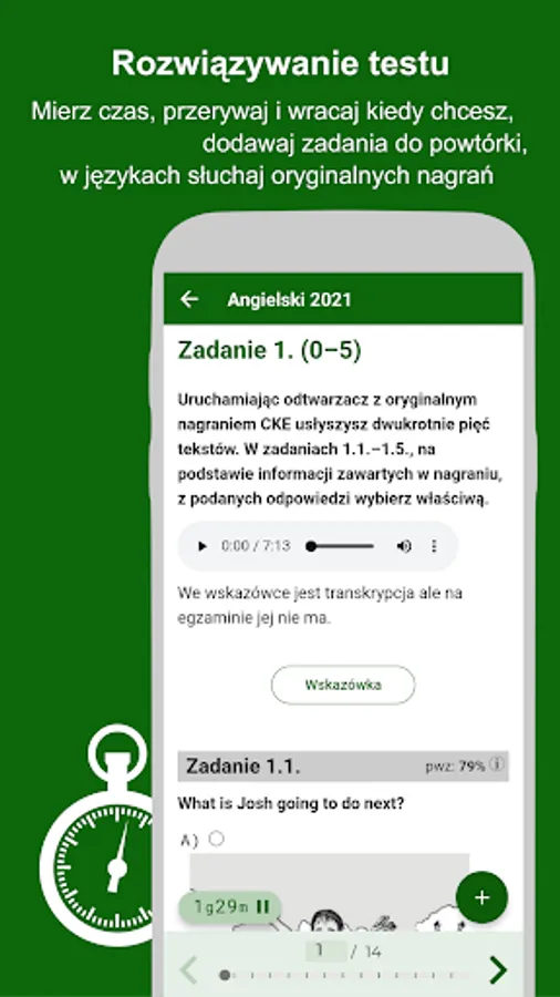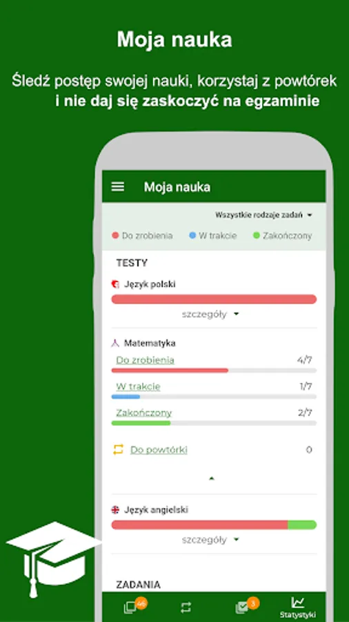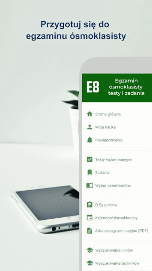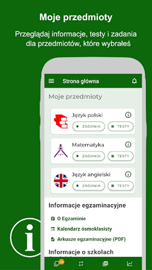 Thanks to the application, you will test your knowledge and prepare better for the exam. You have at your disposal tests and exam assignments in the following subjects: Polish, Maths, English, German, Russian, Spanish, French and Italian.