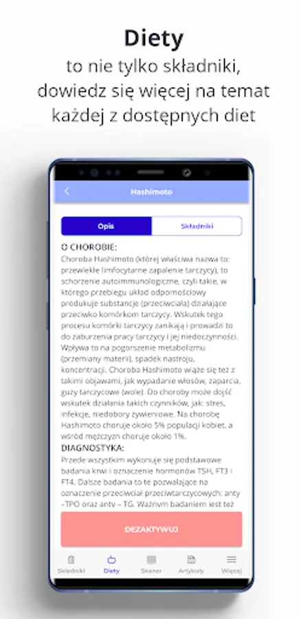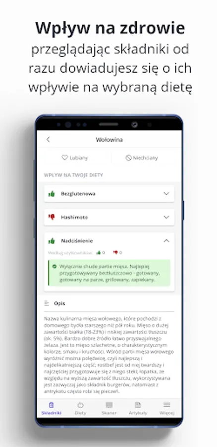 Thanks to "You Know What You Eat" you will not only learn more about a given ingredient or product, but also check its compliance with your diet and nutritional profiles. Are you veg? Do you suffer from hypertension? Do you need to avoid lactose or have a gluten allergy - celiac disease? Or are you pregnant? Check how the composition of a given product will affect your health and whether it is compatible with your diet. Allergy, food intolerance, diet rich in specific ingredients - keep it under control and do healthy shopping. You can also define your own favorite or unwanted ingredients and easily find them in proven products. Healthy food should also be tasty, so if you hate spinach or are allergic to strawberries, the app will alert you to their content.