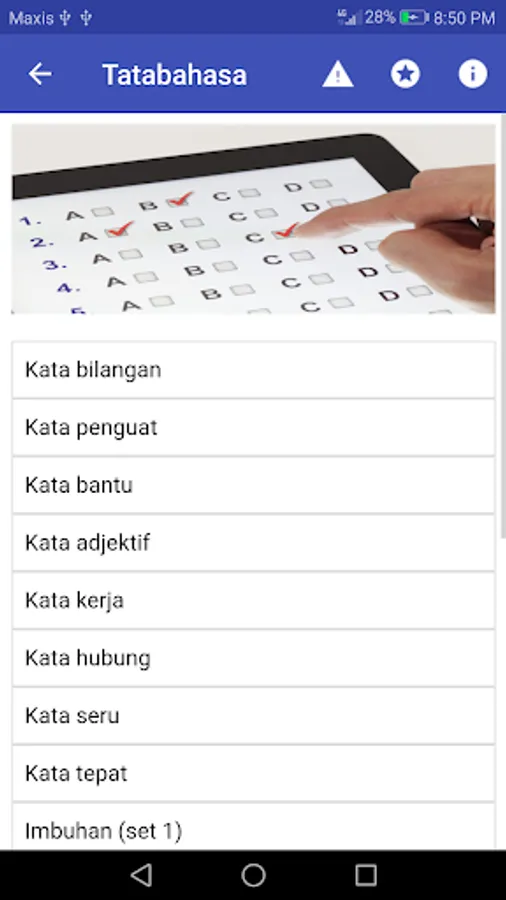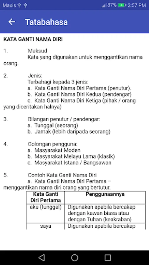 This free app contains notes and exercises for Malay Grammar (tatabahasa). The exercises can be done through the app and the answer will be marked automatically. All contents are available offline.
