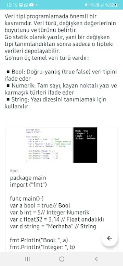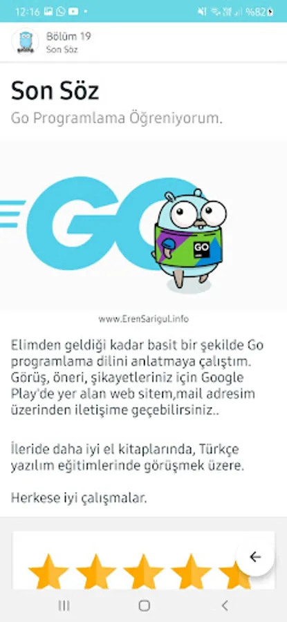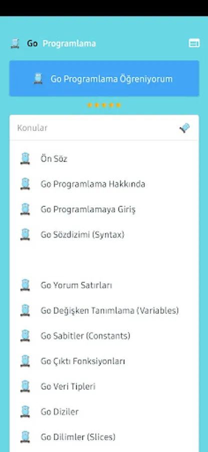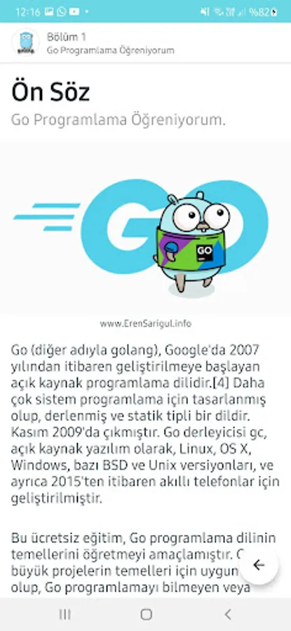 This free tutorial is aimed at teaching the basics of the Go programming language. It is suitable for the basics of very large projects and is suitable for those who do not know Go programming or are beginners. You can help us improve the application by giving points, and you can submit comments, questions and suggestions via the mail logo in the menu section.