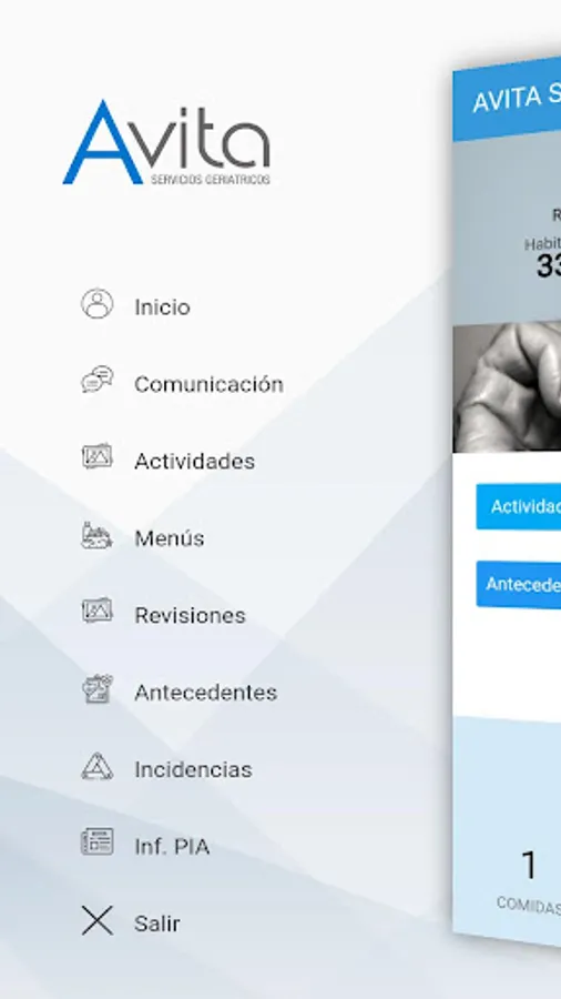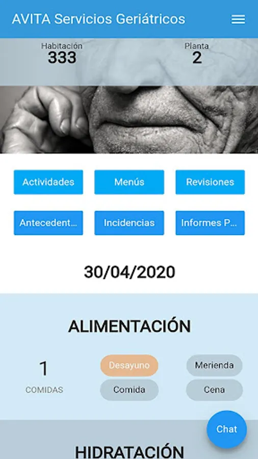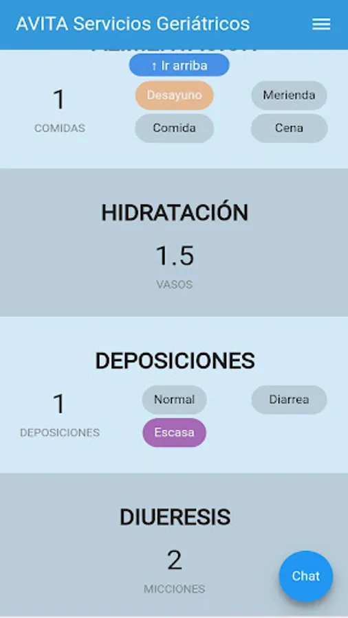 The application is designed to perform daily and real-time monitoring of residents by family members, as well as to improve the direct communication of family members with the caregivers of their residents, offering a flow of fluid, constant and updated information. Data such as meals, hydration, diueresis, bowel movements, sleep, medical exams, etc., will be available through your mobile device.
