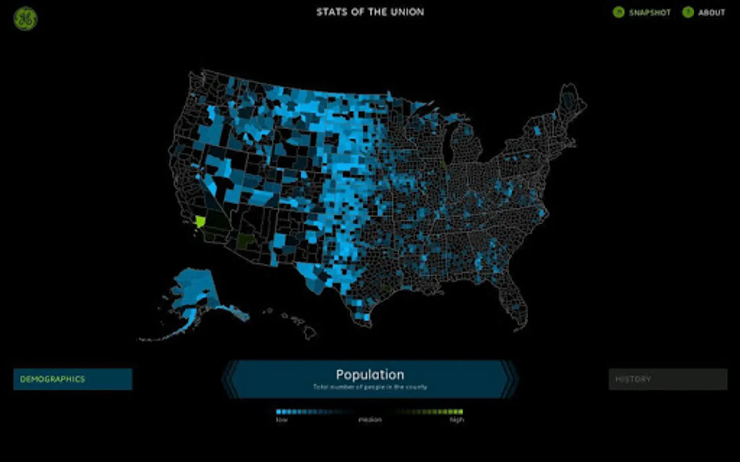 • However, using the median doesn't fix all of the enormous ranges in the distributions. In the case of the population map, for instance, the upper half of the counties have values quite close to the median value, so they're colored much closer to black. On the other side, there are many counties that have sizes much closer together, which causes there to be a large number of counties that are brightly colored blue.