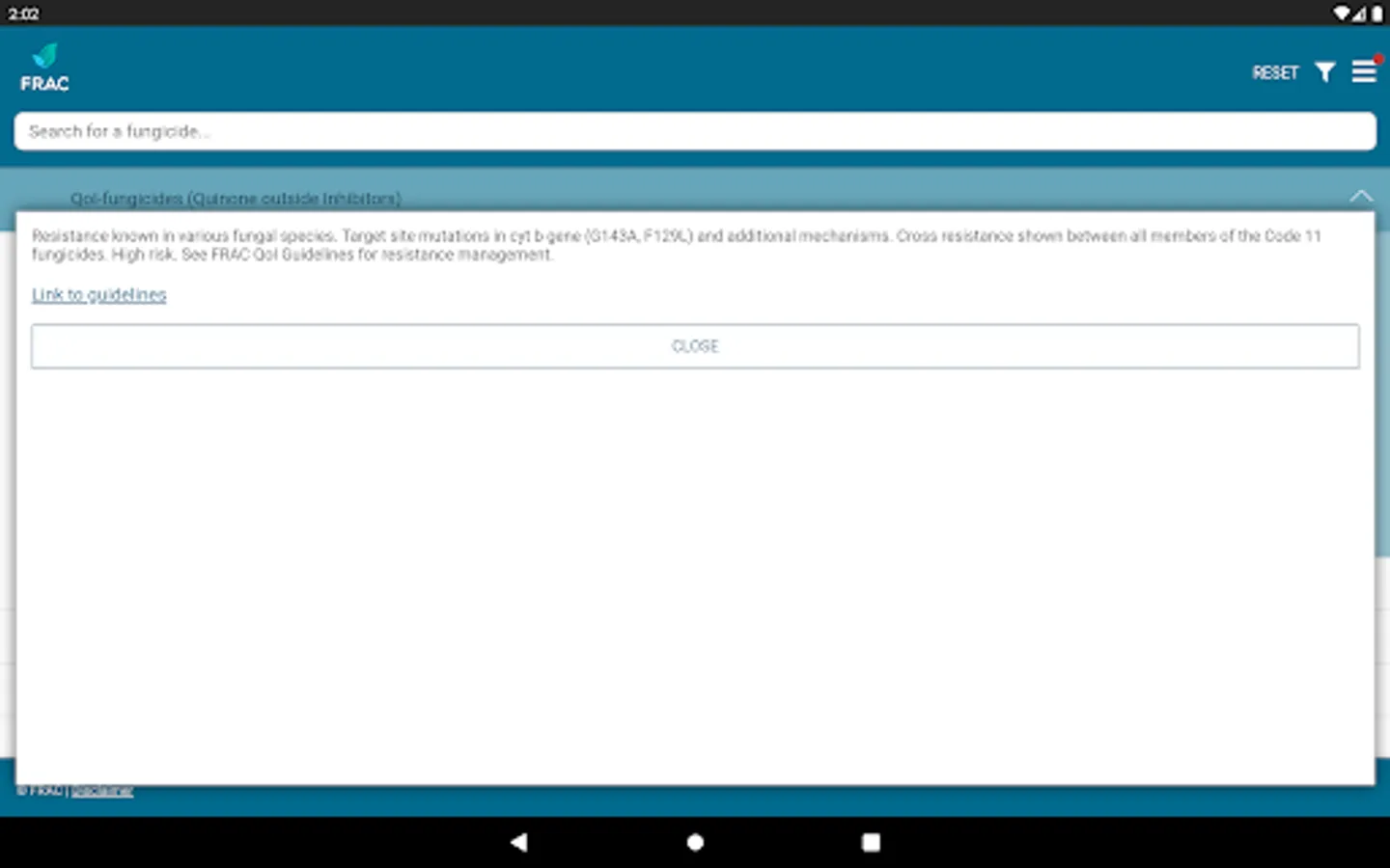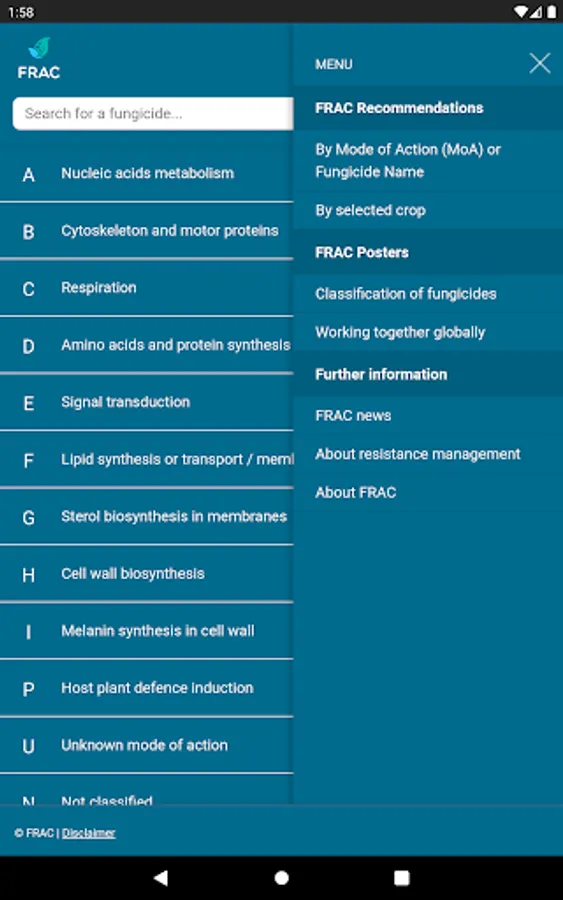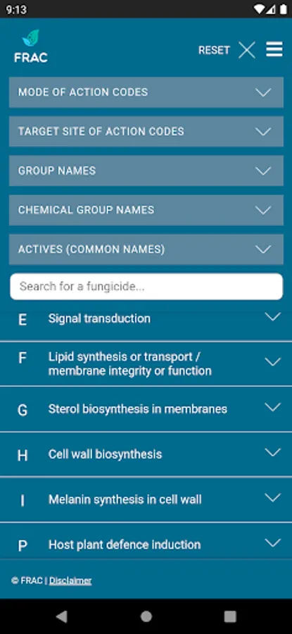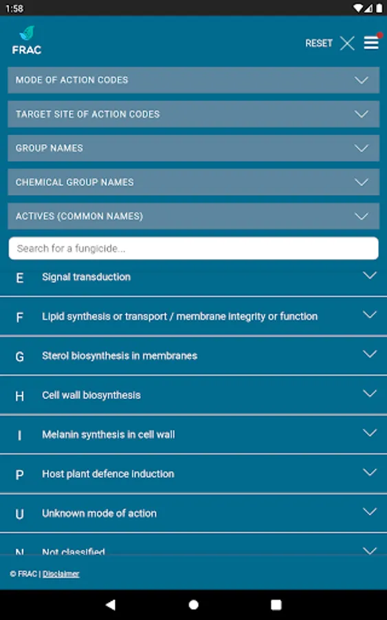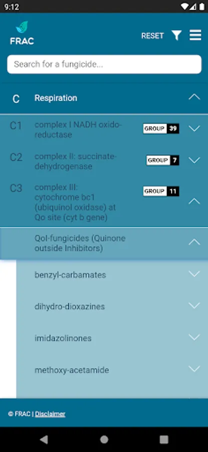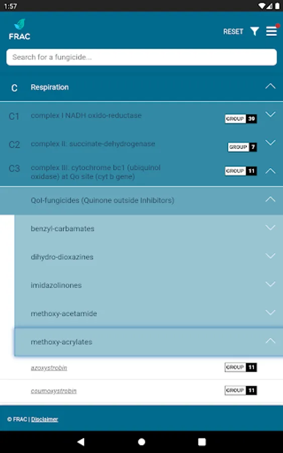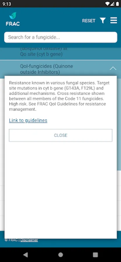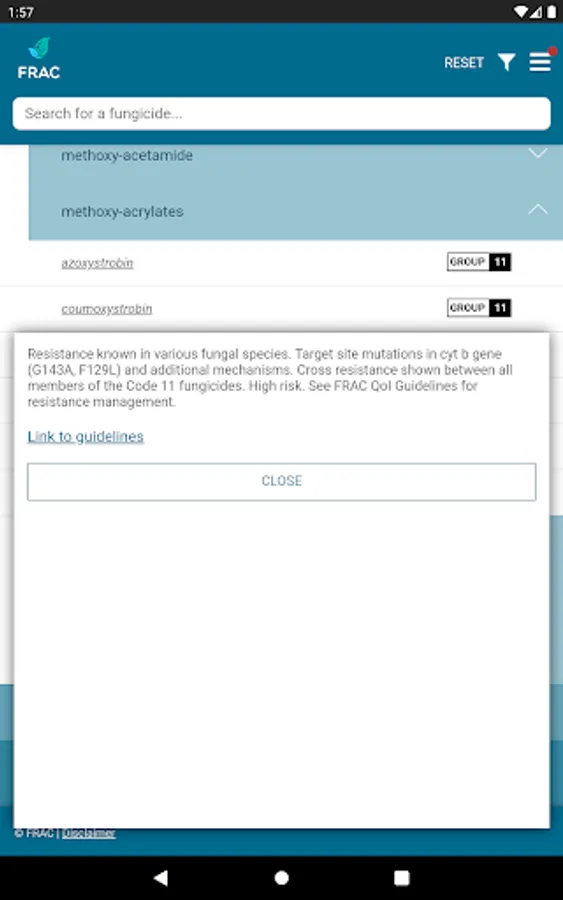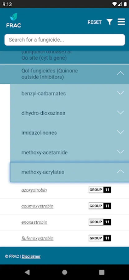 The FRAC MoA application allows you to search which active ingredients belong to which mode of action group. Tipping on the actives name provides a broad overview about the resistance situation and the need for fungicide resistance management.