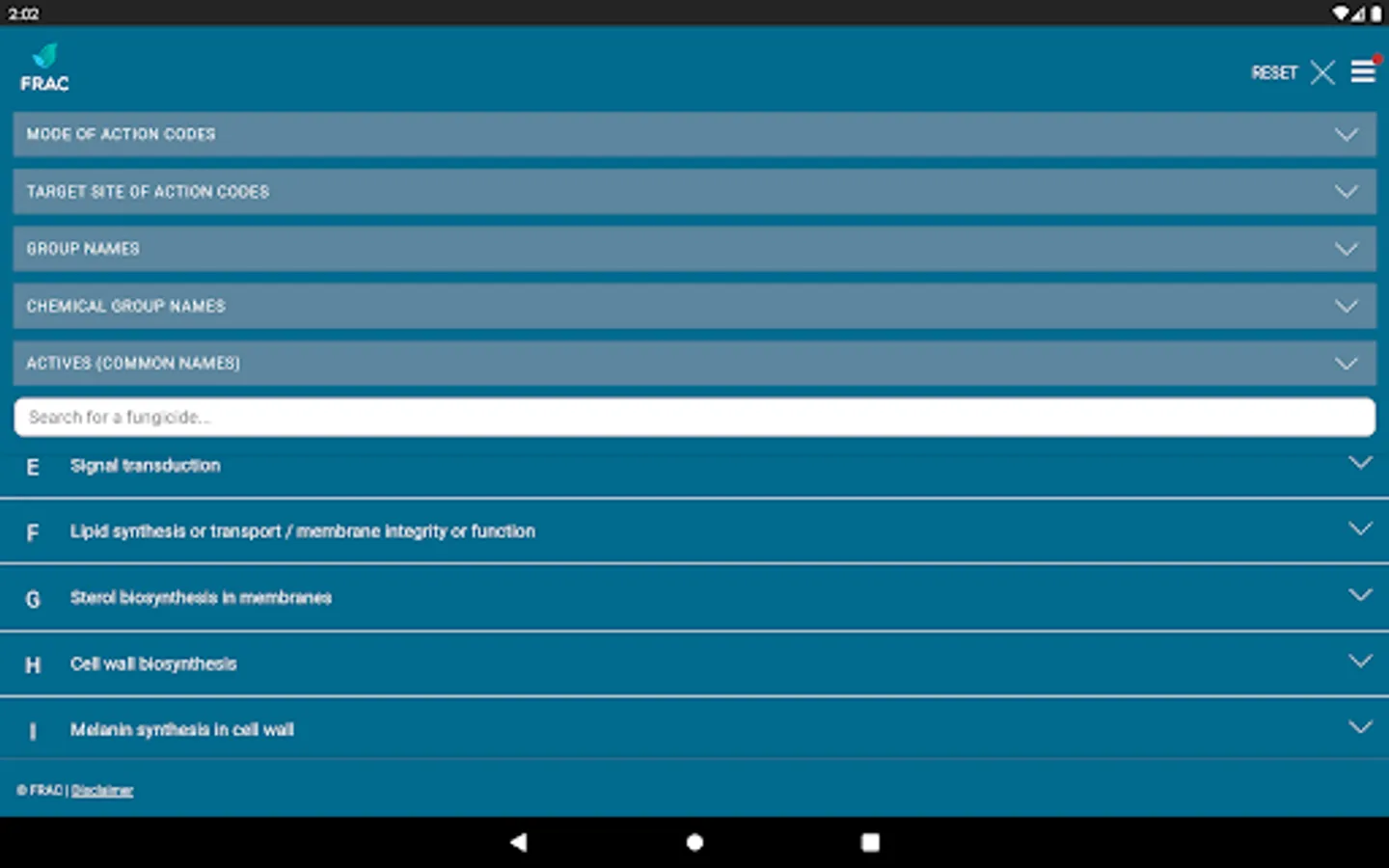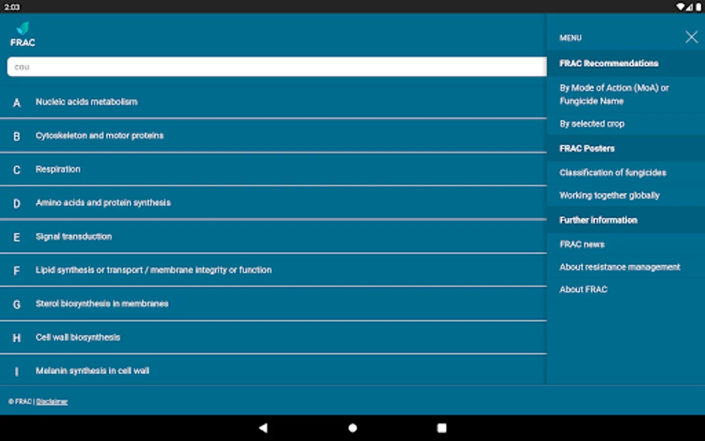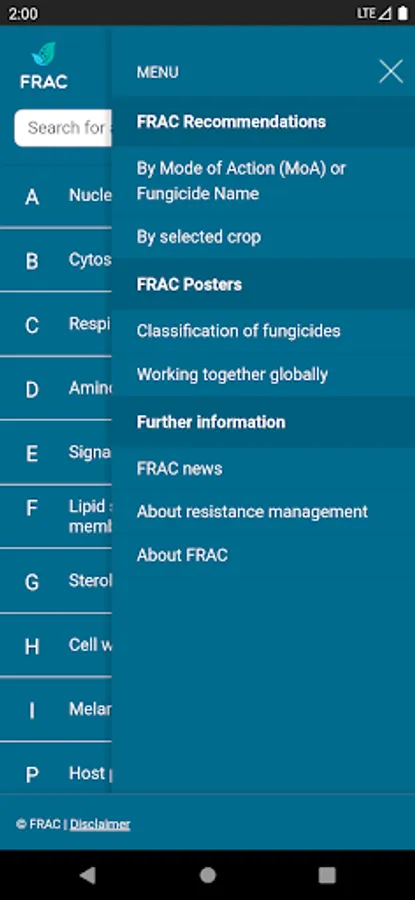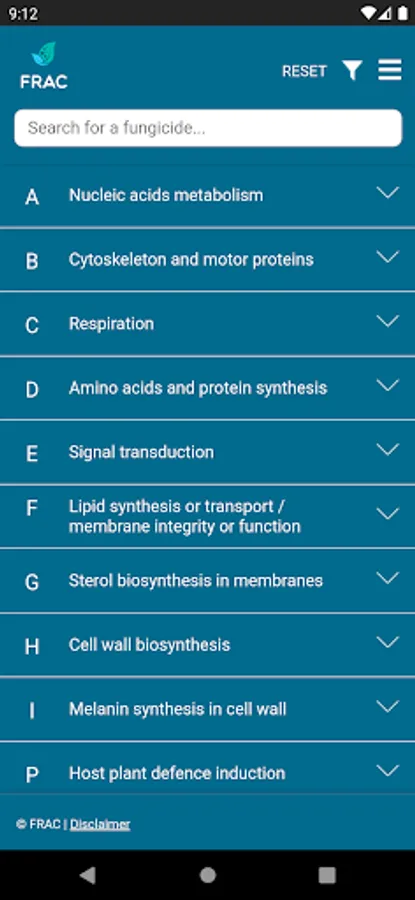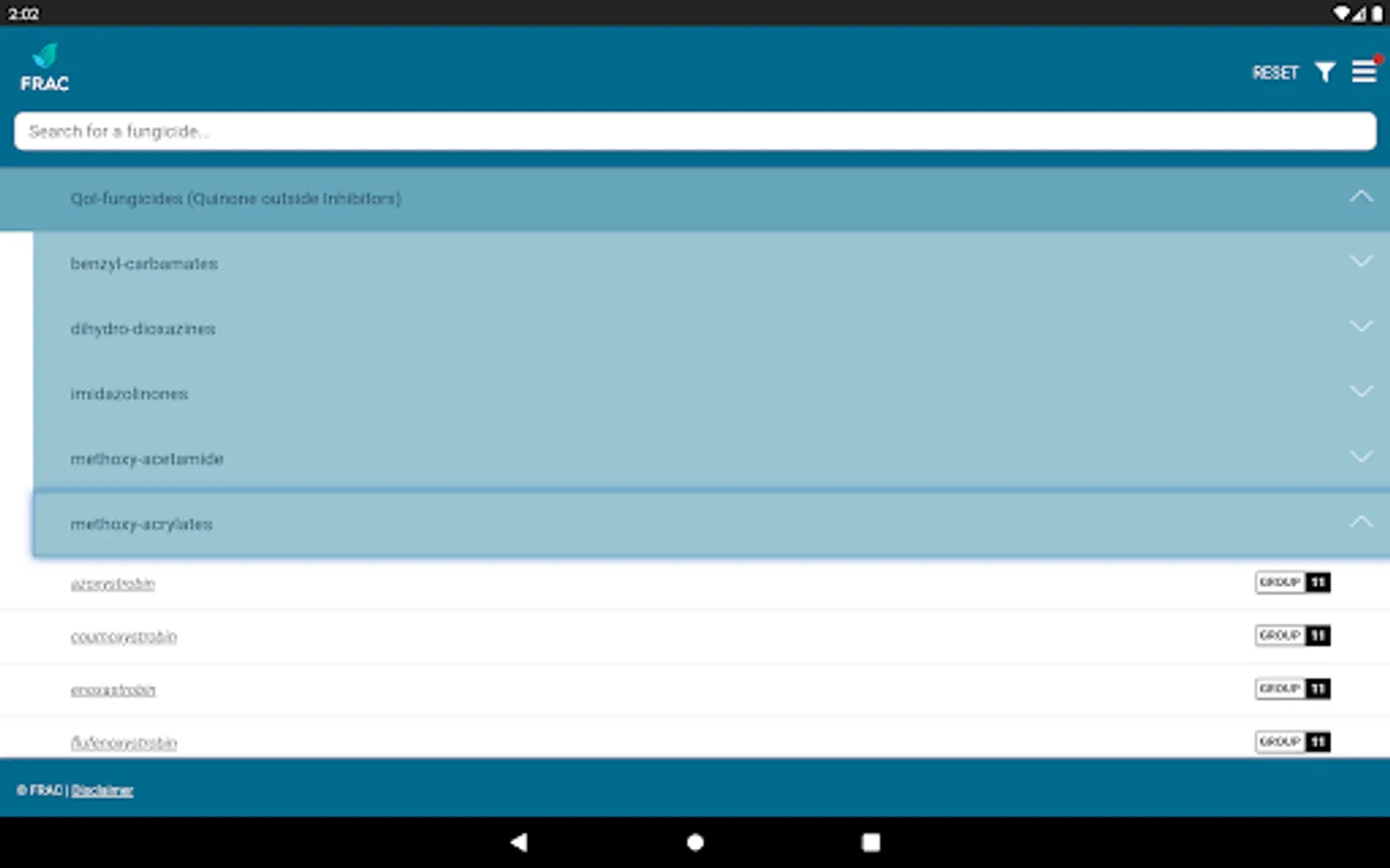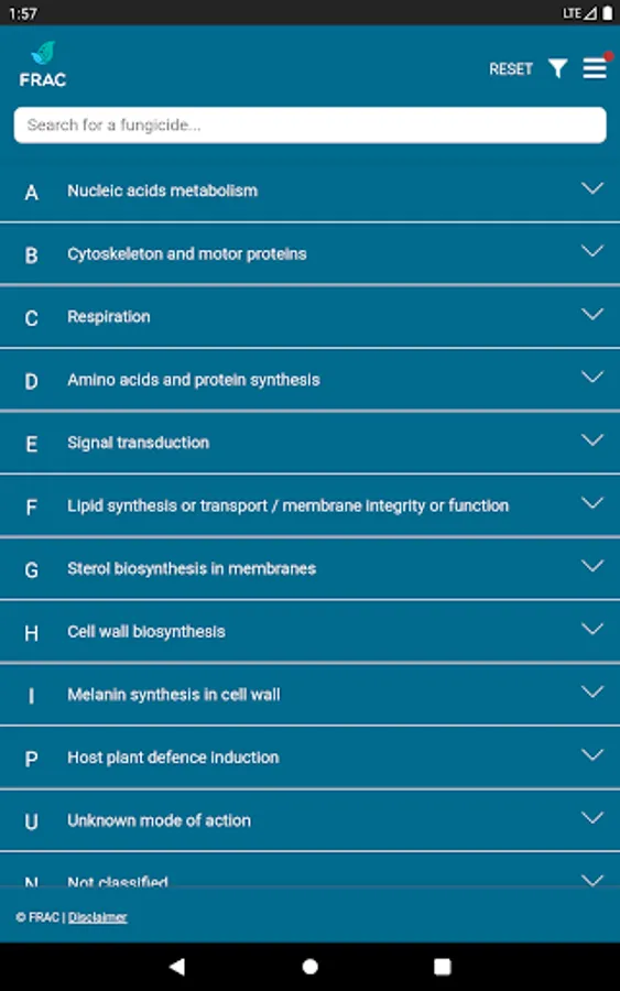 The FRAC MoA application allows you to search which active ingredients belong to which mode of action group. Tipping on the actives name provides a broad overview about the resistance situation and the need for fungicide resistance management.