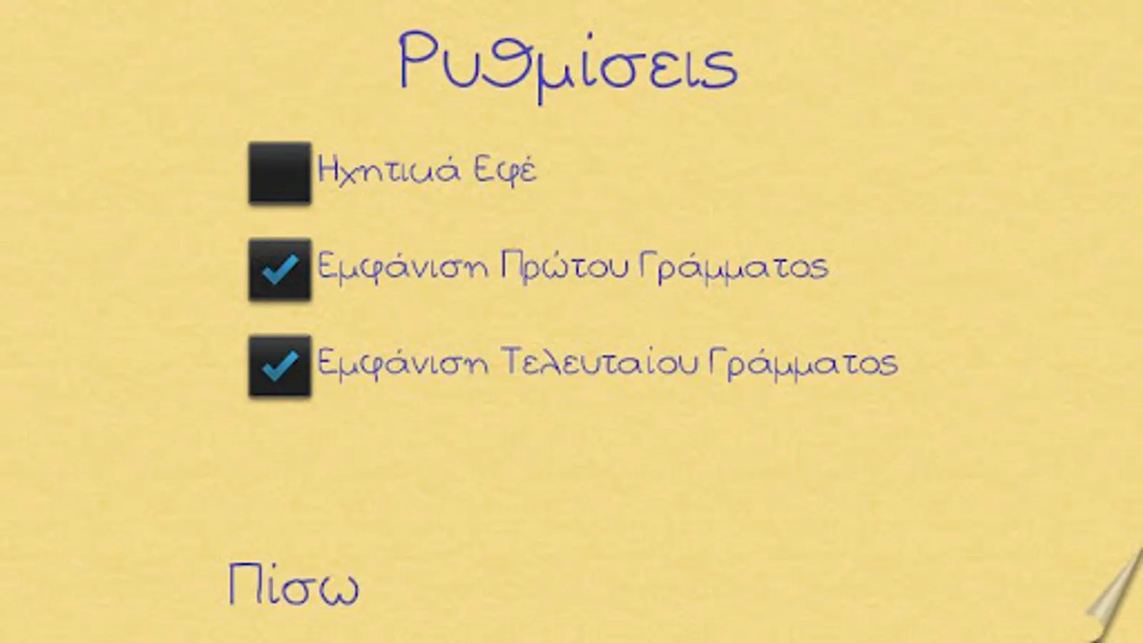✓ Ρυθμίσεις δυσκολίας (εμφάνιση πρώτου ή/και τελευταίου γράμματος)