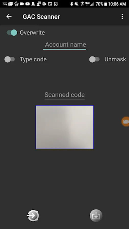 The application can be started locally on Android or remotely from a Gear or Galaxy Watch device. Having a Gear device is not required though. To start it from your Gear device, select "Connect to Phone" menu in GAC application. After the Gear device is connected, many options are available for transferring data between devices. A new account can be created by scanning a QR bar code or by entering a secret manually.