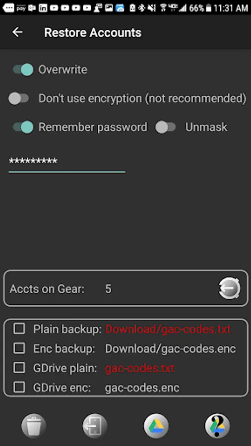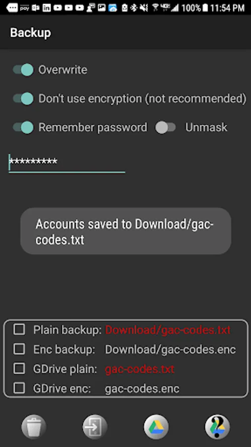 Accounts can be saved to and restored from an unencrypted or encrypted backup file stored in a local phone's storage or on Google Drive. Encryption is based on a password provided by a user. Encrypted backup will be signed with an HMAC signature to make sure that a backup is not corrupted during a restore operation. Unencrypted and password-less backups are available as well, but not recommended.