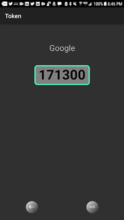 Tapping an account's name or token on the accounts page will open a zoomed view for a single account. A token in the zoomed view will be updated automatically when an old token is expired. Accounts can be scrolled on this page using left and right arrows.