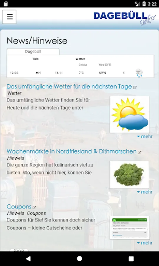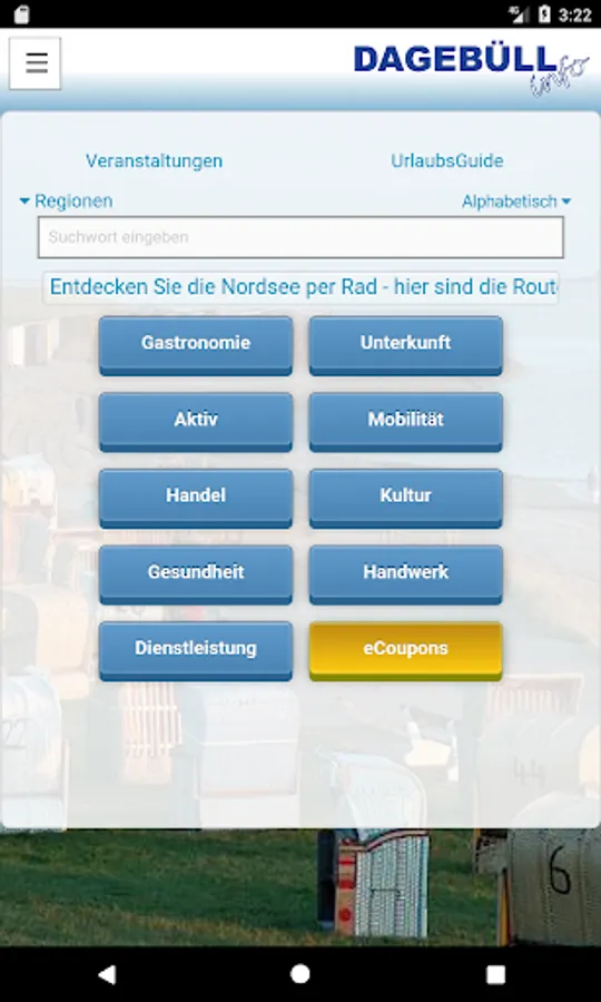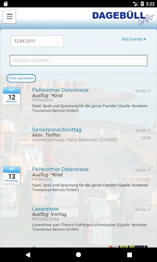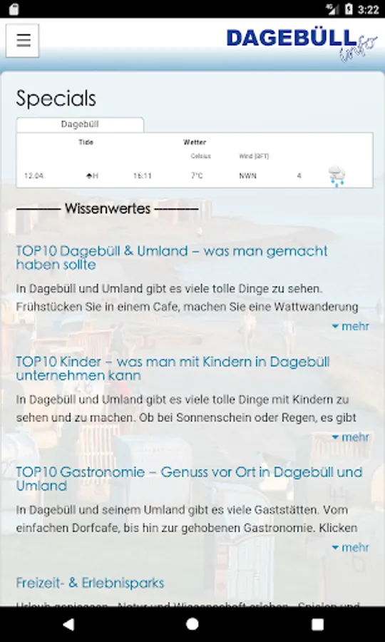 This free app from Dagebüll and surroundings is the useful companion for planning, booking and make their journey. Using a full-text search, a calendar or different Search by category and features, the information can be selected that best meet the needs and demands. The compilation of favorites as a vacation planner, the interests of a country. In addition to the alphabetical representation, the representation by distance or on a map is possible. Apart from a brief information about the object (restaurant, attraction, hotel, u.v.a.m.) are also all contact options, alternatives to search and, if reviews are available.