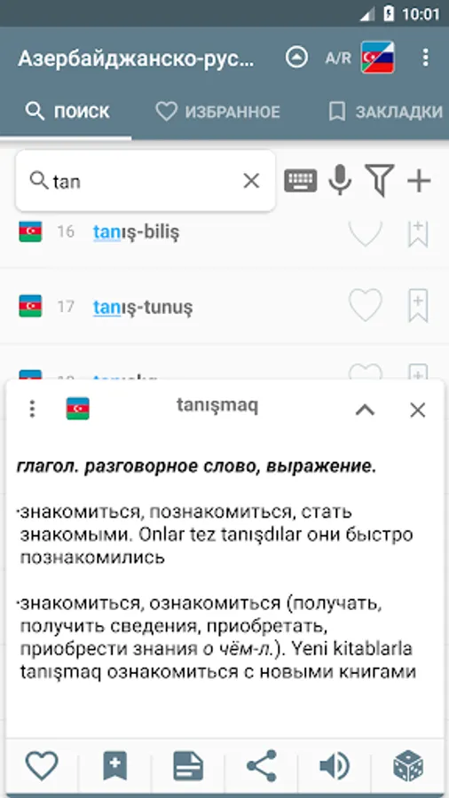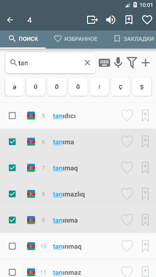 • Seçilmişlər siyahısı (Favorite) - bəyəndiyiniz sözü "ürək" düyməsini basmaqla bu siyahıya əlavə edə bilərsiniz.