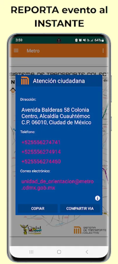 Easy direct access to the map of the Metro Lines, Metrobús, Light Rail, Trolleybus, among others. In addition, it includes a description of the transport, service hours, cost of the service and contact numbers for citizen attention.