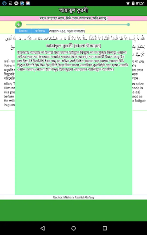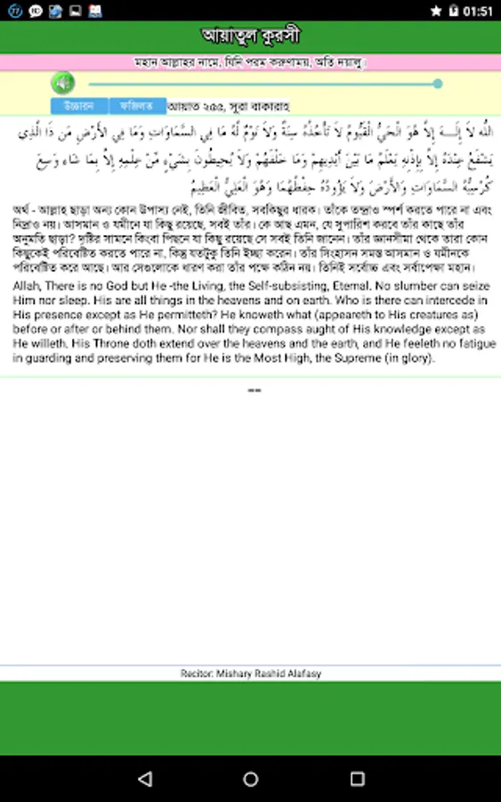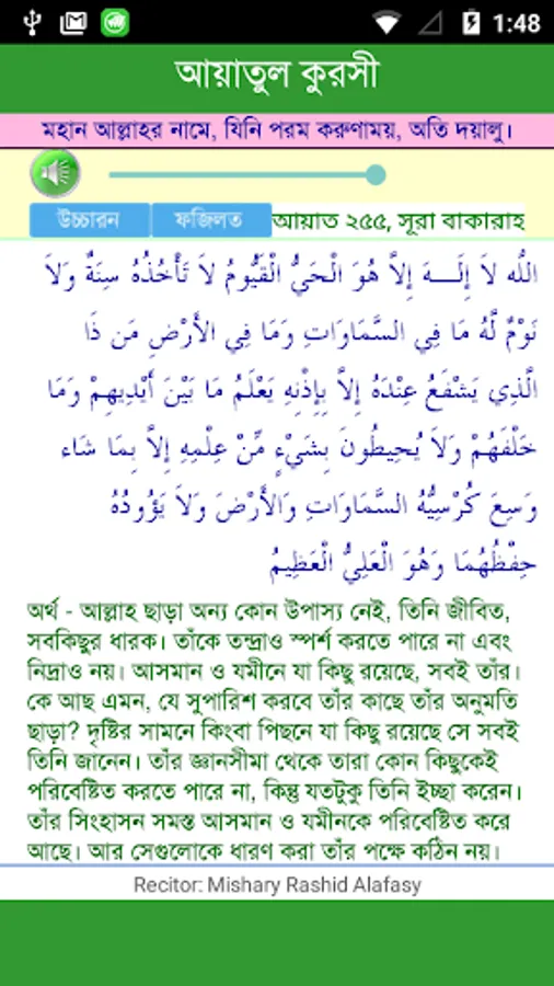 The Arabic text, the transliteration, the Bengali and English translation and then some of the benefits of reciting this verse have been included in the app, Beautiful recitation by Qari Mishary Rashid Alafasy has also been included.