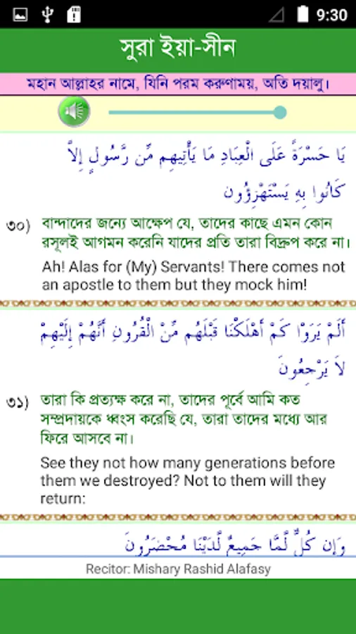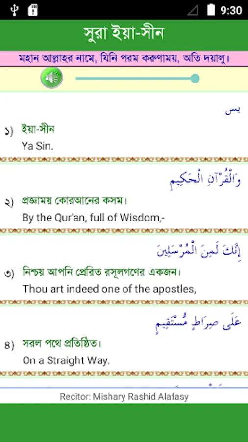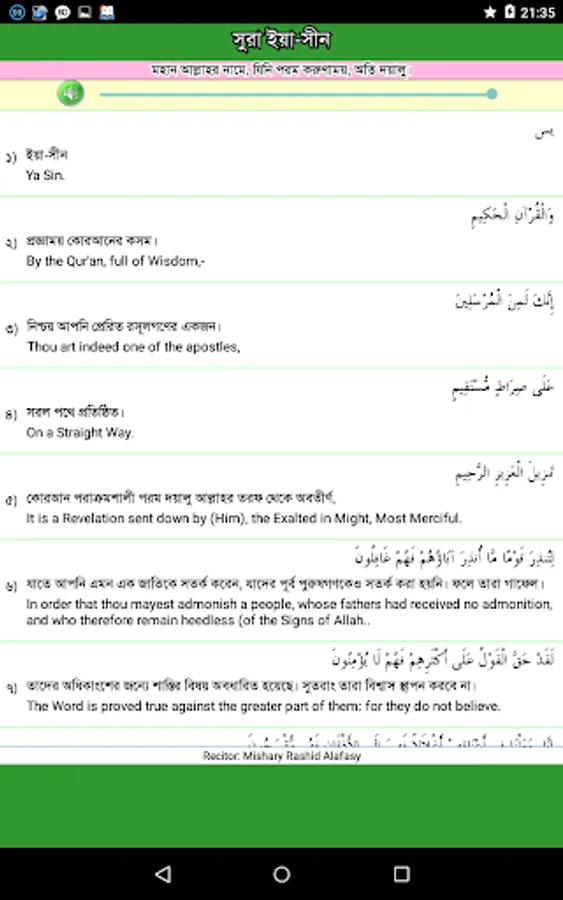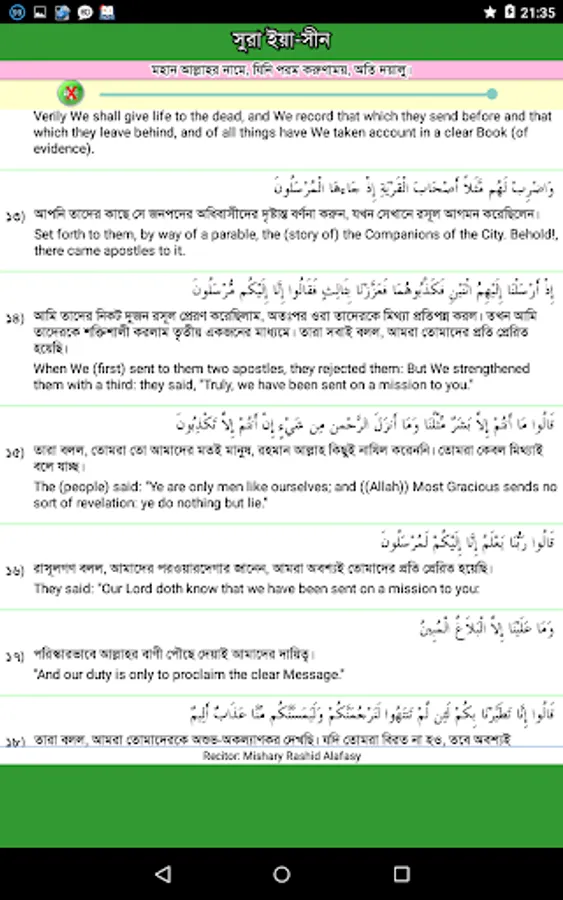 Sura Ya-Seen is the 36th sura of the Holy Quran. Beautiful recitation of the Sura by prominent Qari Mishary Rashid Alafasy has been included in this apps. Along with the Telawah the meaning of the verses in Bengali and English also included.