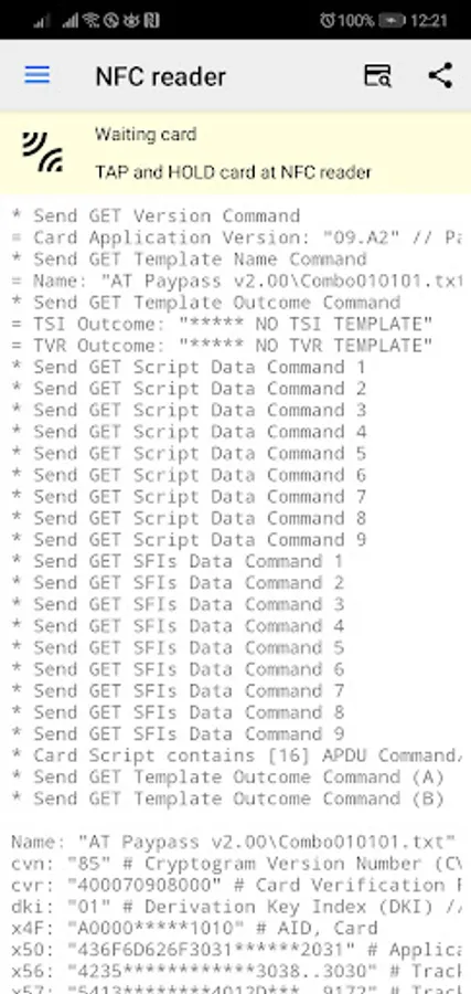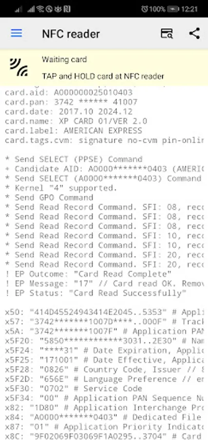 Card data reading implemented with PPSE selection, AID selection, GPO and Read Records APDU commands execution.