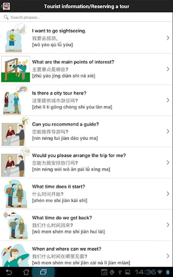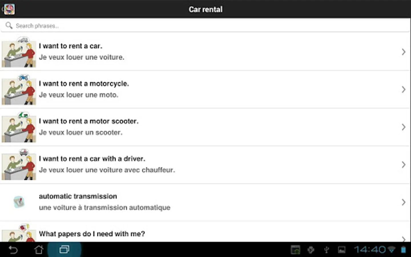 The integrated search function makes it even easier to find what you need. If, for example, you want to book a single room in a hotel, simply key in "single" and the phrase "I would like to book a single room" already appears on the screen.