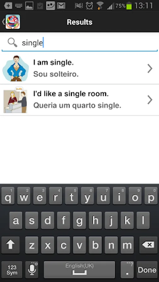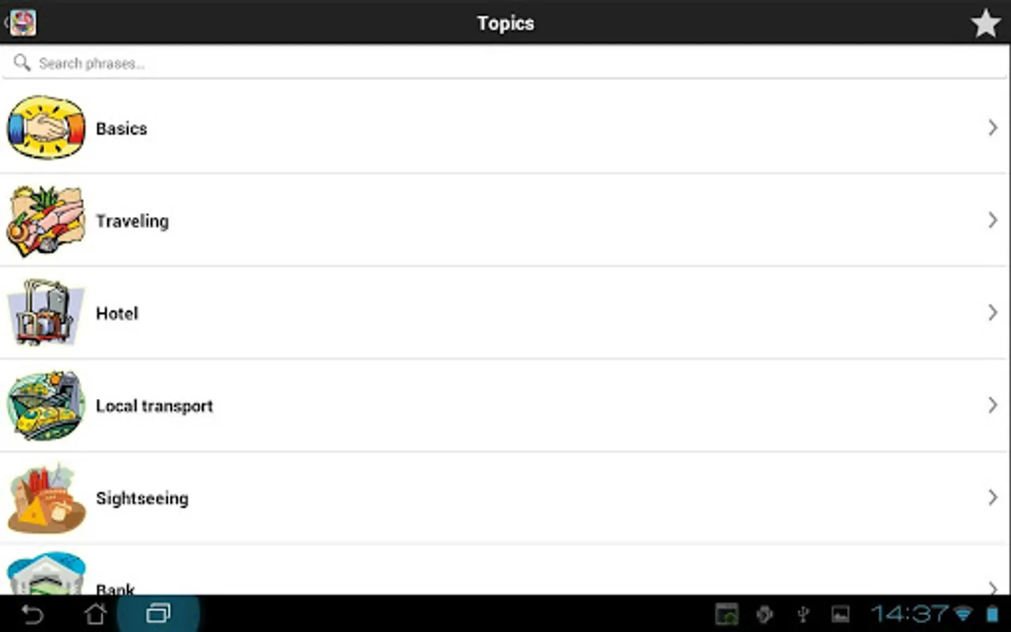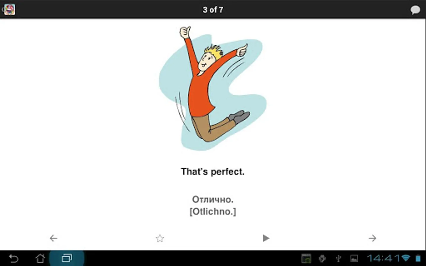 • Exercise based on the flashcard drill concept, so that you can learn words and phrases from your favorites list.