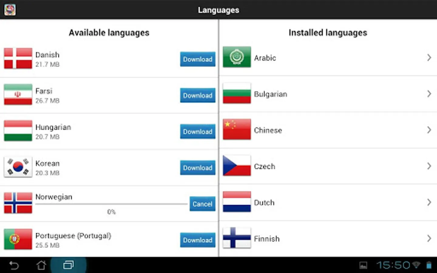 • You download only the languages you need. Each language takes about 25 MB free space on your SD-card.