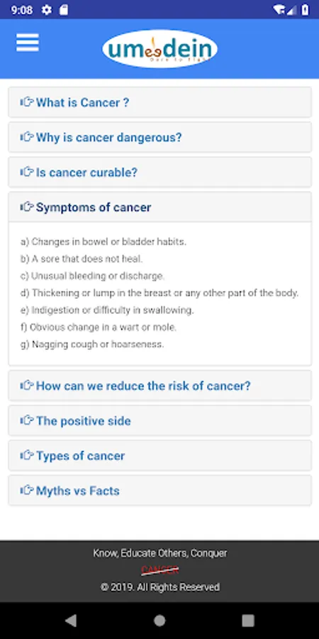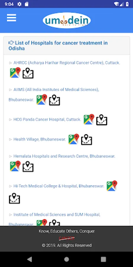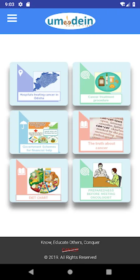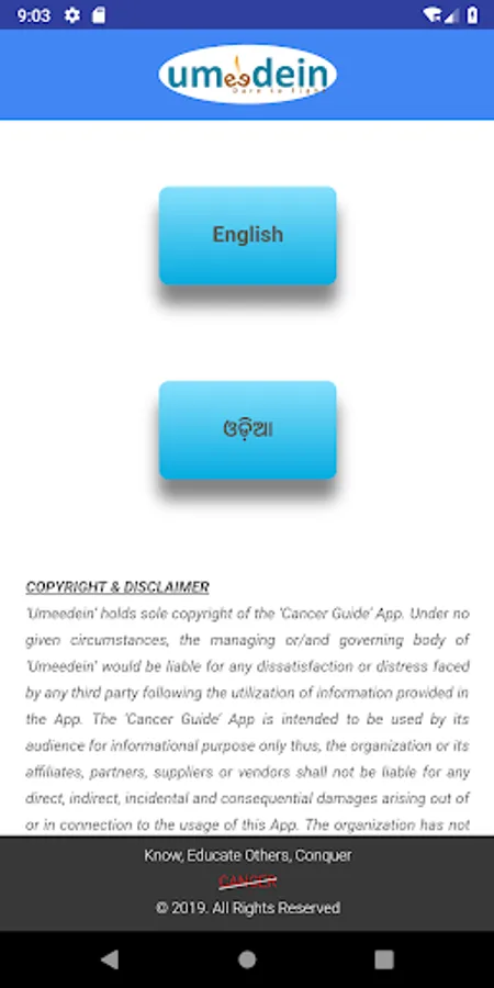 ‘Umeedein’ holds sole copyright of the ‘Cancer Guide’ App. Under no given circumstances, the managing or/and governing body of ‘Umeedein’ would be liable for any dissatisfaction or distress faced by any third party following the utilization of information provided in the App. The ‘Cancer Guide’ App is intended to be used by its audience for informational purpose only thus, the organization or its affiliates, partners, suppliers or vendors shall not be liable for any direct, indirect, incidental and consequential damages arising out of or in connection to the usage of this App. The organization has not sought or received any financial aid or in-kind support from any other organizations to develop this App therefore, the scope of conflict of interest is void therein. All disputes are subjected to Bhubaneswar (Odisha) jurisdiction only.