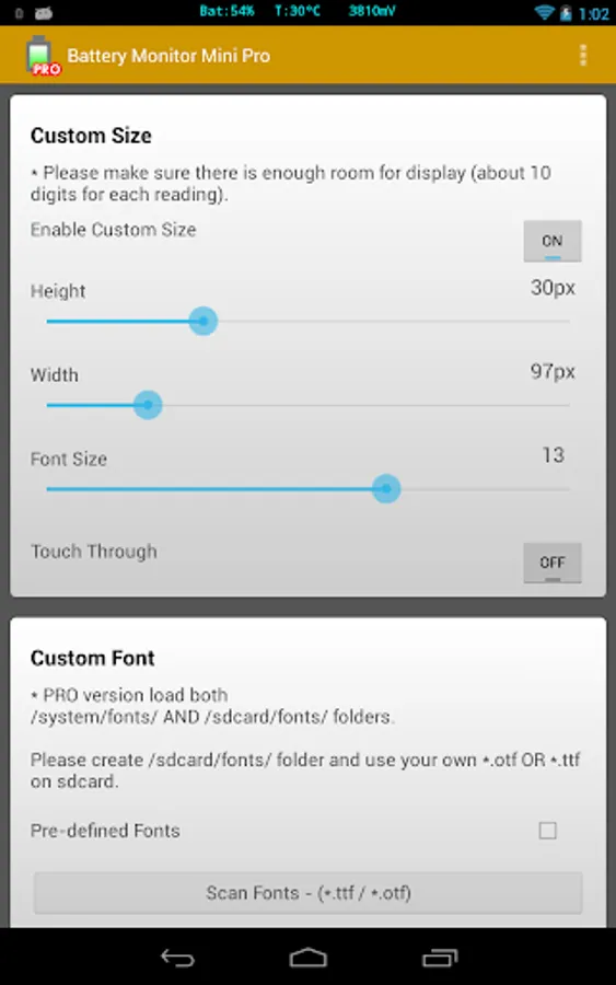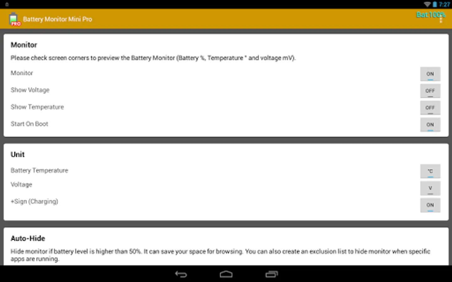 This is a mini battery monitor for your phone. It monitor the battery level in %, temperature usage in °C or °F, and voltage. It will always stay in the corner of your phone's screen. You can set the indicator to any corners of the screen, customize the color and transparency of the indicator. Advanced notification support battery usage chart for 12 hours.