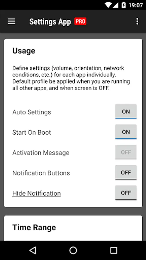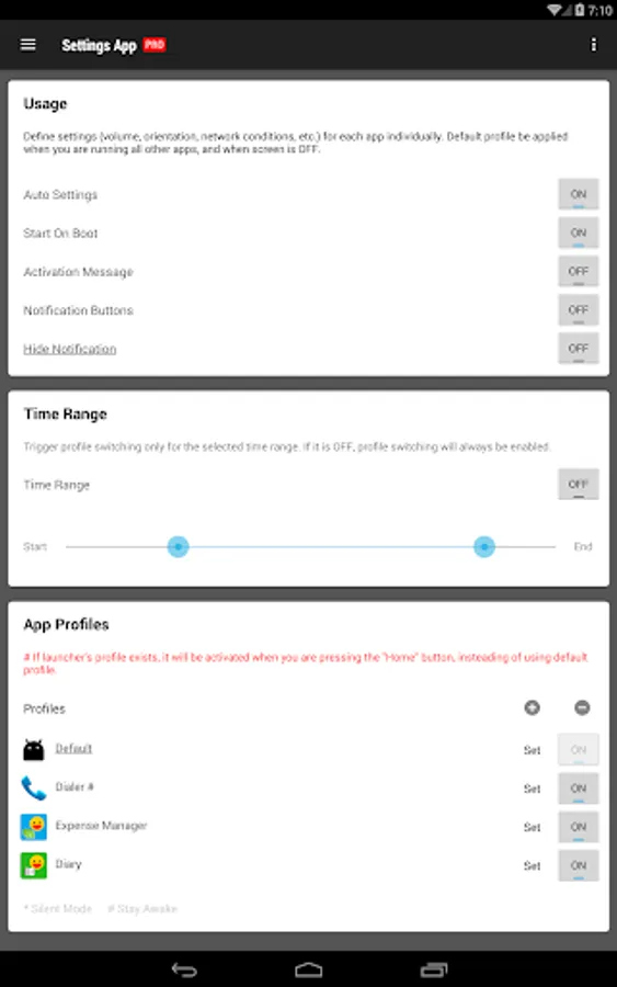 Different apps need different configurations and settings. This app help you to switch to different set of settings for your each of your app individually. It includes volume, orientation, network conditions, bluetooth connection, screen brightness, keep screen awake, etc.