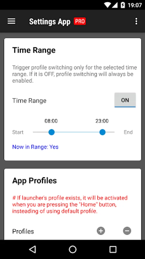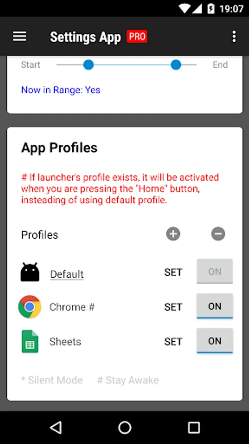 You can create profile for each app. When you launch the app, the corresponding profile will be applied. After that, you can adjust the settings as usual. The profile is to serve as a setting template for your app, and it will only be applied when you app START. Please also set up the default profile. It will be applied when you are running all other apps, and when your screen is off.