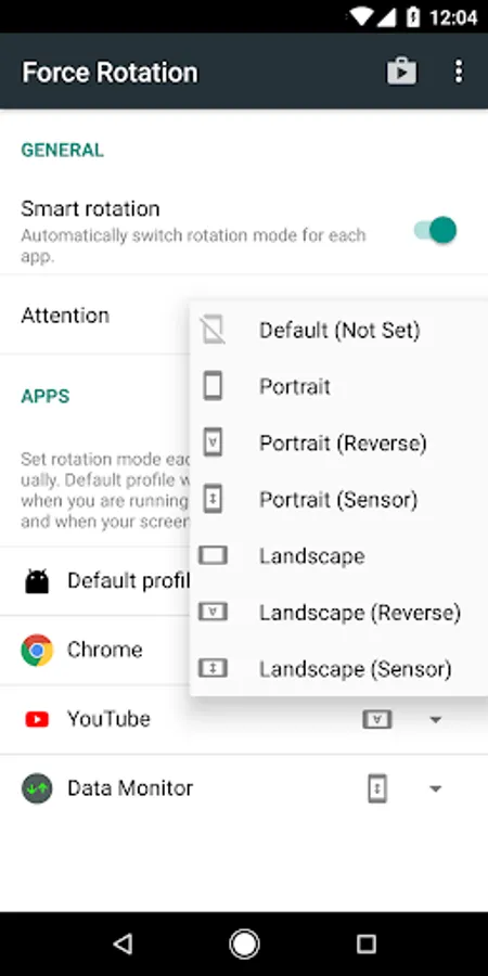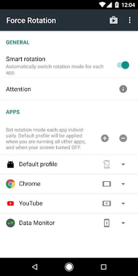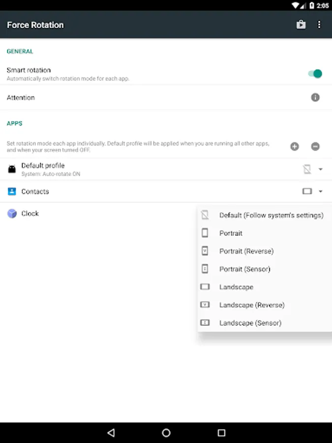 Add "Force Rotation" feature for other apps. It overrides system's settings, and allow you to change rotation setting for your apps.