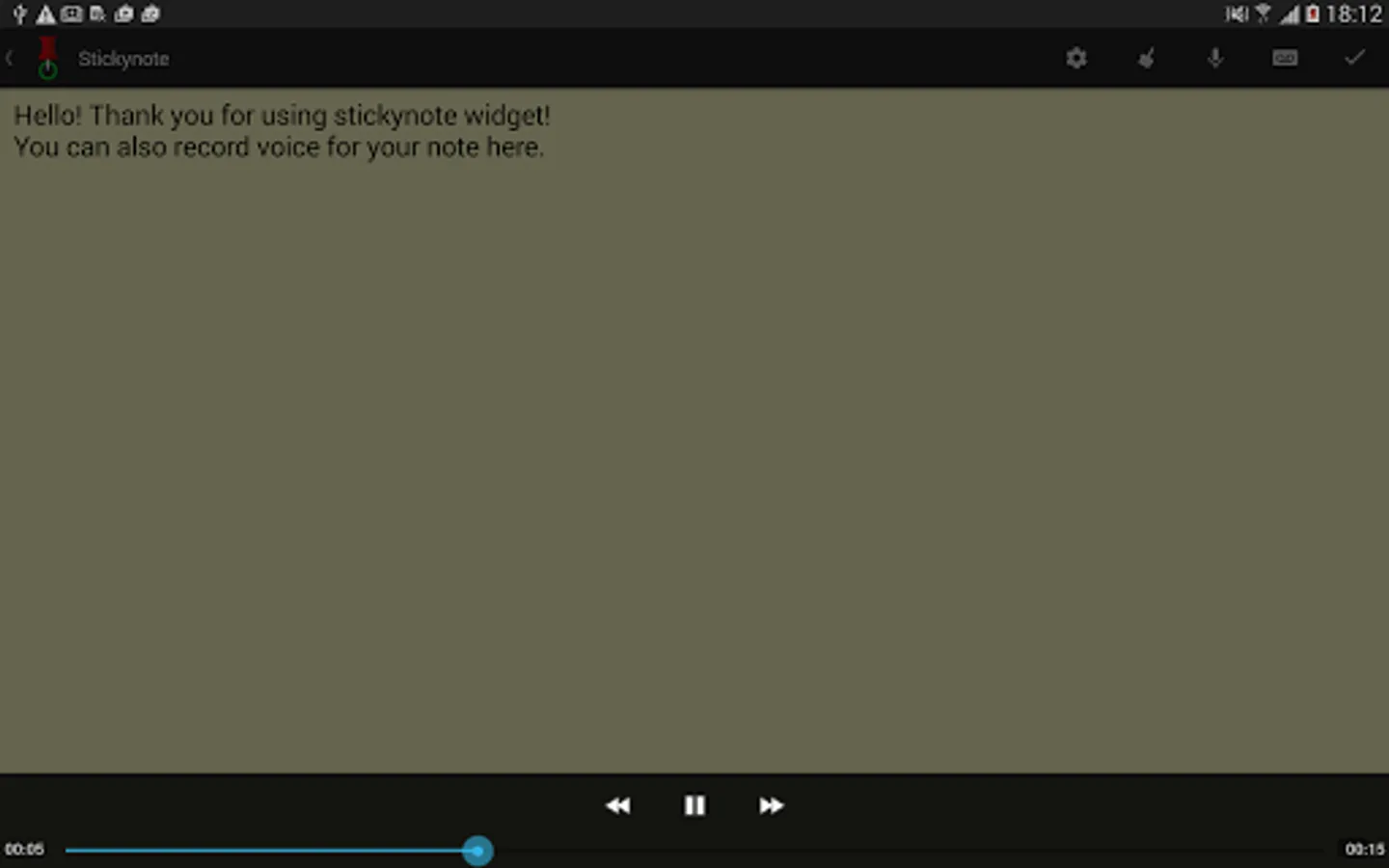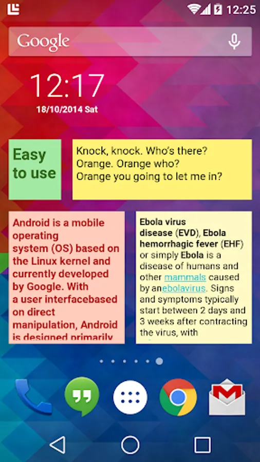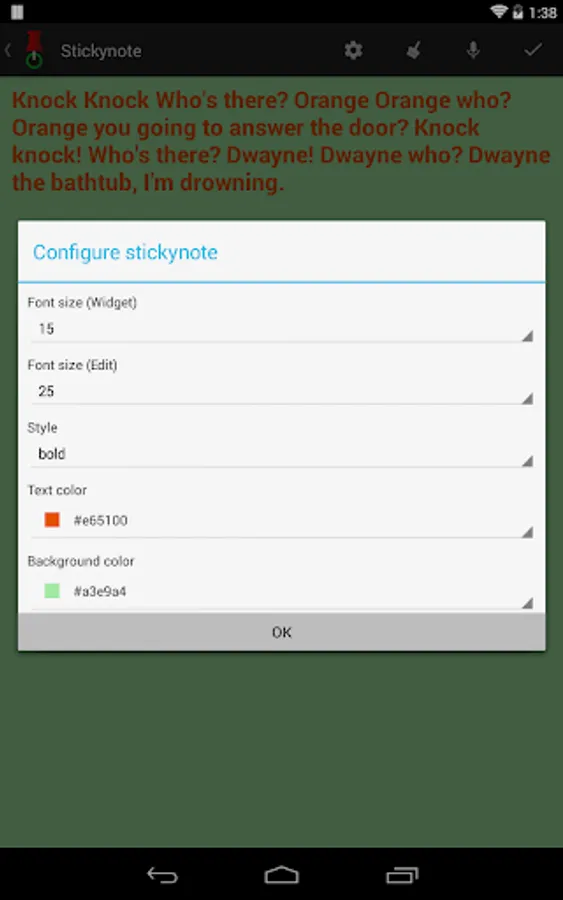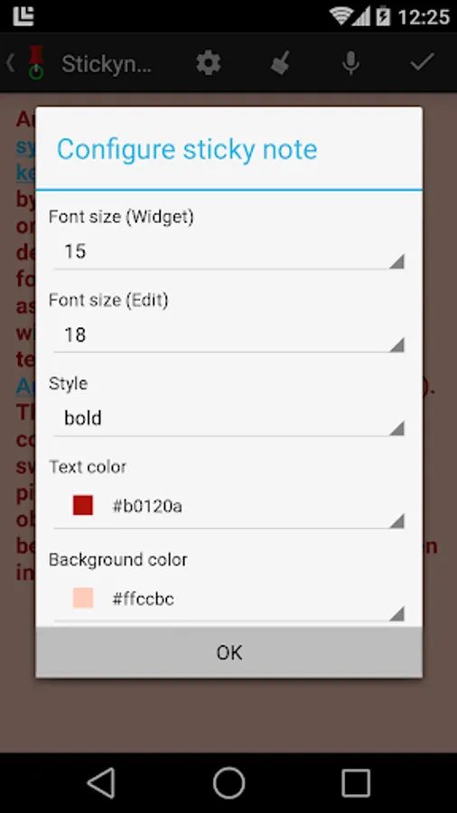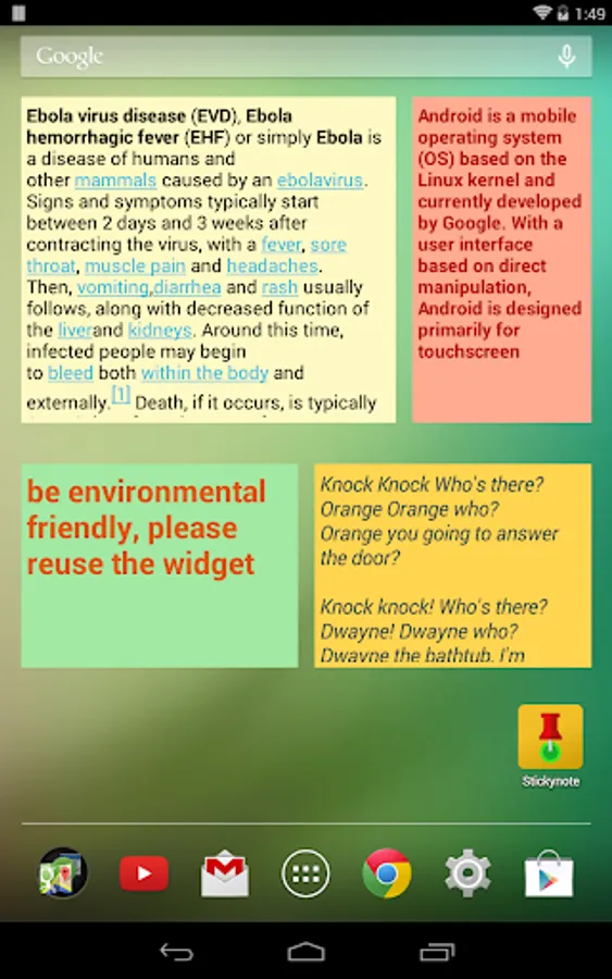 Put sticky notes on your home screen. You can put any text on your note, and configure the appearance of your note, including font size, font style, font color, note background, etc. All notes are re-sizable. Manage and fill in your sticky note easily.