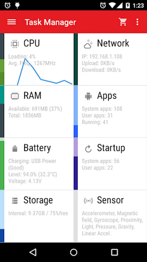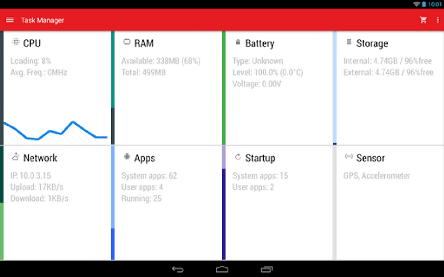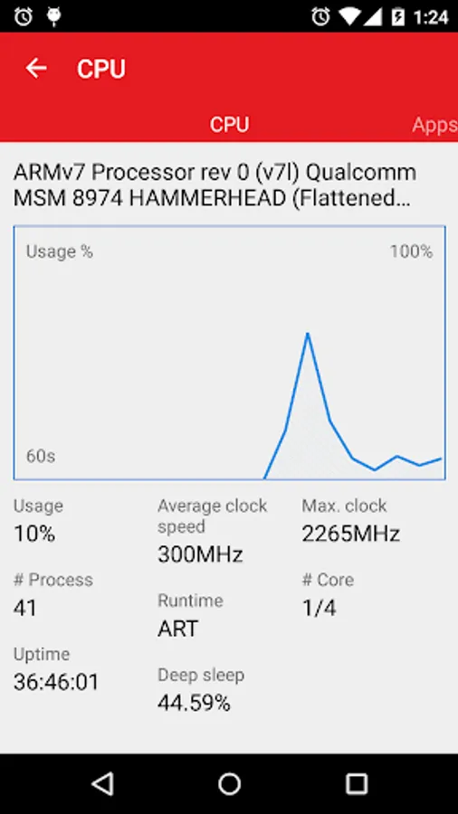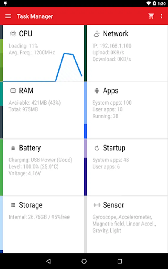 It keep track of your CPU, clock frequency, thermal sensors readings, etc. It also analysis RAM usage, storage by apps. You can also extract your apk files. Rooted only feature include wake lock list, and logcat / dumpsys reader.