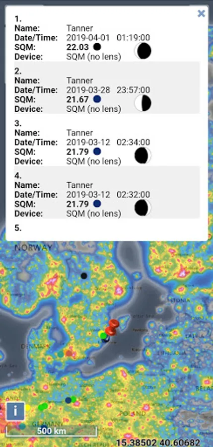 - SQM, SQM-L, SQC, SQM-LE, SQM readings submitted by users